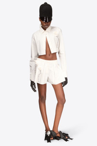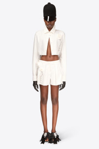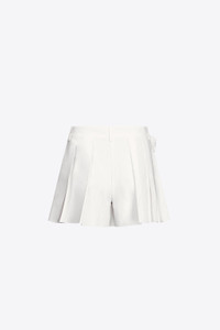 Poplin front pleat skort embellished with rosette & crystal trim. Available in Off White. - 100% Cotton - Dry Clean Only - Model is 5'11.5" and wears a size US 2
