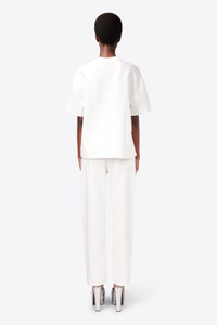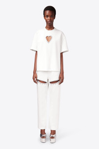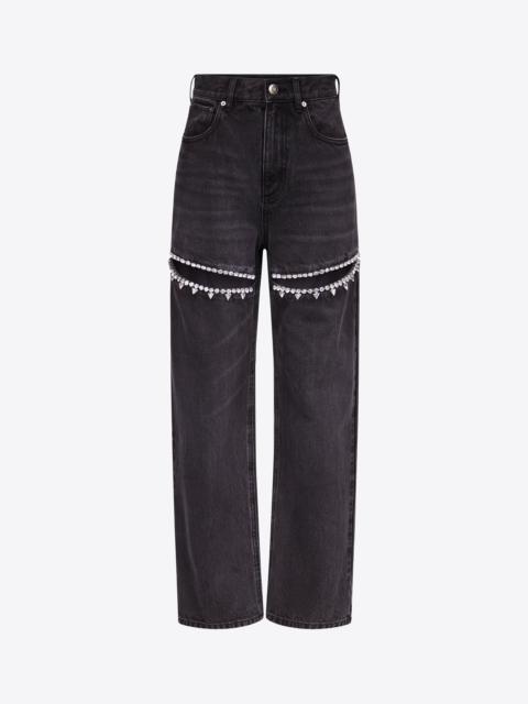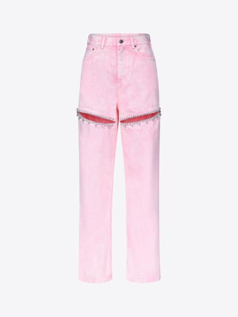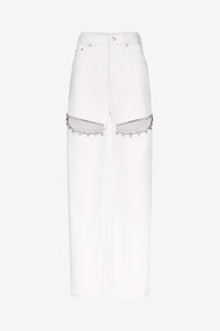 Classic denim jeans feature crystal cupchain trim slits at thighs. Designed with straight leg and mid-rise for a relaxed fit. If in between sizes, we recommend you size down. Available in White, Light Blue, Black & Pink. - 100% Cotton - Dry Clean Only - Runs large. We recommend taking 1 size down.