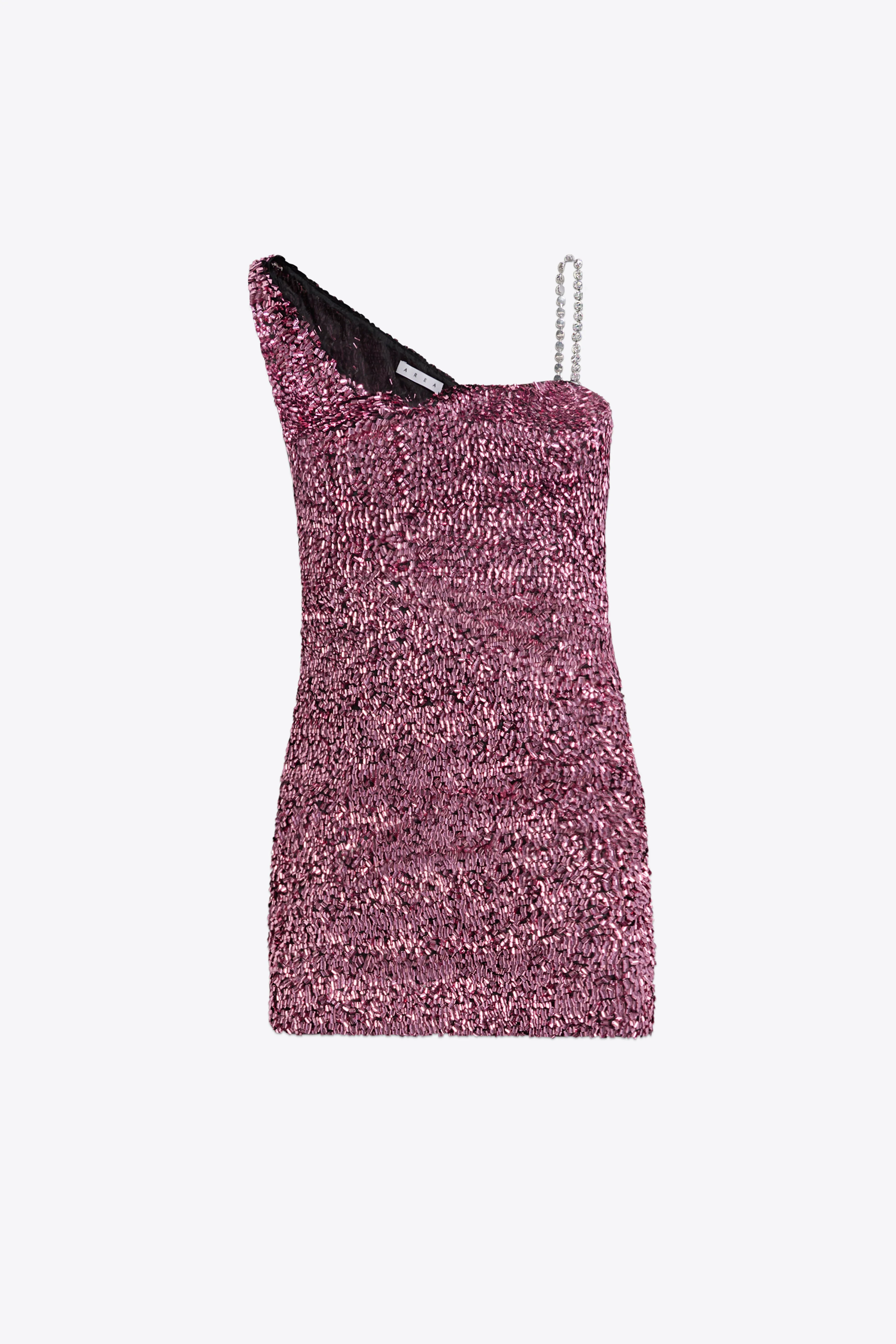 Sequin mini dress featuring crystal strap embellishment. Available in Metallic Rose. - 95% Polyester, 5% Nylon - Dry Clean Only - Model is 5'8" and wears a size 2