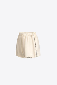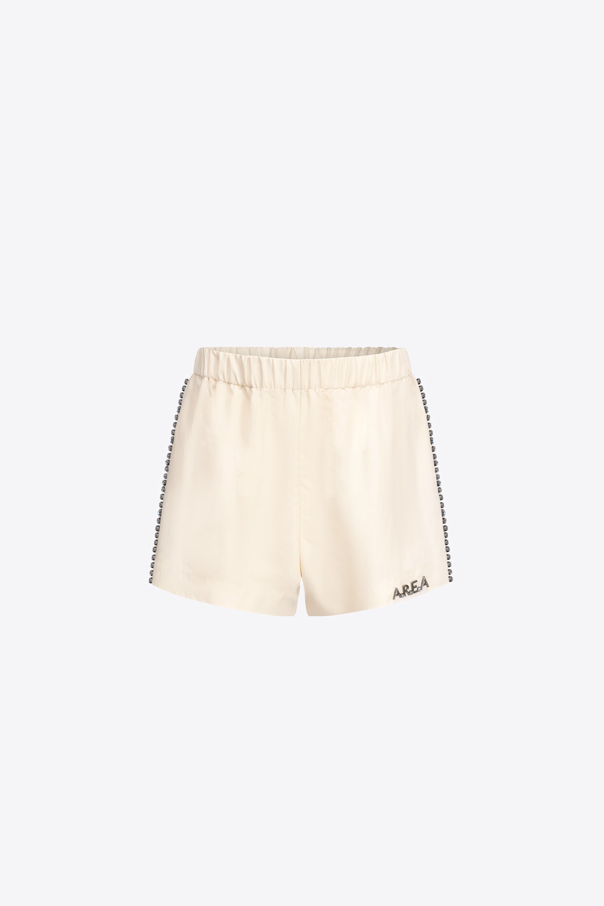 Crystal trim track short featuring AREA logo. Available in Cream White & Black. - 100% Nylon - Dry Clean Only - Model is 5'11.5" and wears a size S