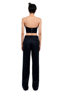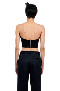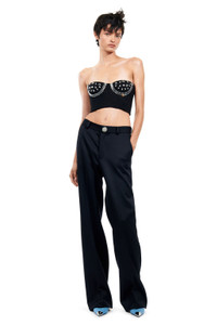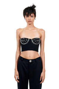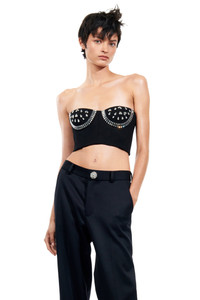 Compact ponte jersey crystal watermelon cup bustier. Features underwire cups, boning at the seams, and back zipper closure. Available in Black & Fuchsia. - 67% Rayon, 28% Nylon, 5% Spandex - Dry Clean Only - Model is 5'10.5" and wears a S