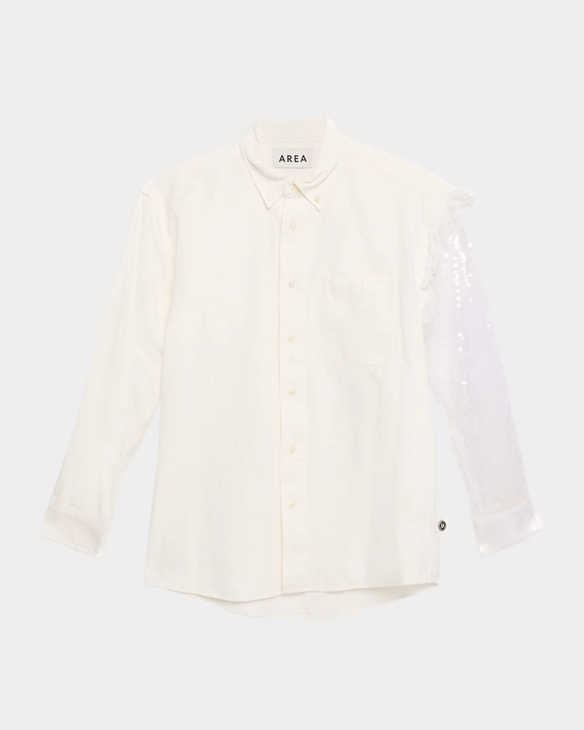 Crafted from crisp cotton poplin, this shirt from AREA features a deconstructed left shoulder that leads to a sequined sleeve Button-point collar; button front Long sleeves; button cuffs Yoked back Loose fit Hem falls below the hip Shirttail hem Cotton Imported SIZE & FITModel measurements: 5 & apos;10" tallModel is wearing a US size 4/Small