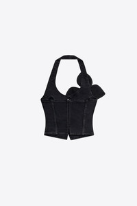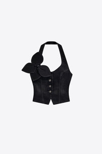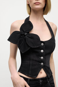Denim button front halter top with bow embellishment. Available in Washed Black. - Made in Italy - 98% Cotton, 2% Elastane - Dry Clean Only - Model is 5'9.5" and wears a size 2