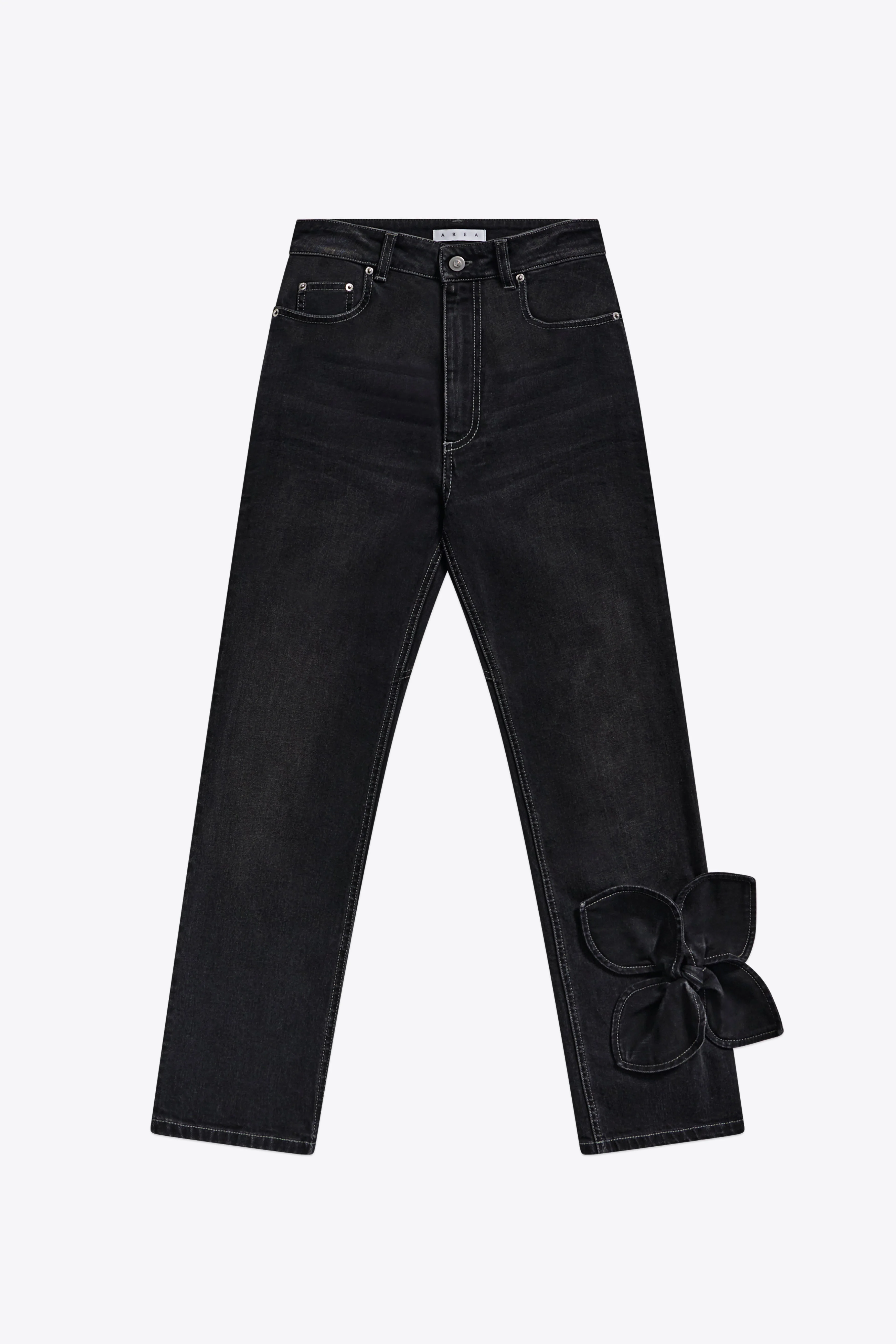 Straight leg jean featuring denim bow embellishment at pant leg. Available in Washed Black. - Made in Italy - 98% Cotton, 2% Elastane - Dry Clean Only - Model is 5'9.5" and wears a size 27