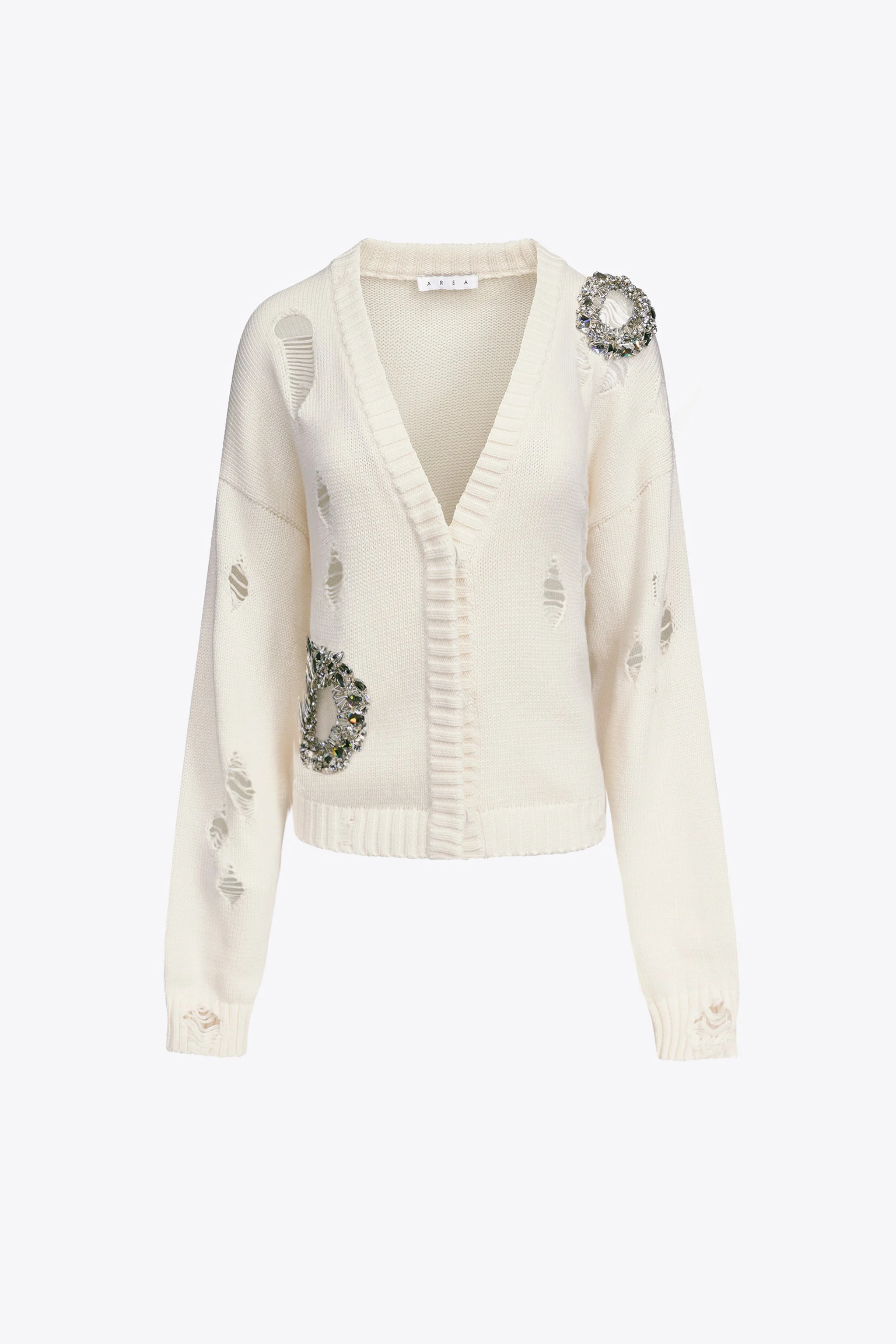 Cashmere blend cardigan with distressed crystal embellishment and front snap button closure. Available in Cream & Heathered Gray. - Made in Italy - 90% Cotton, 10% Cashmere - Dry Clean Only