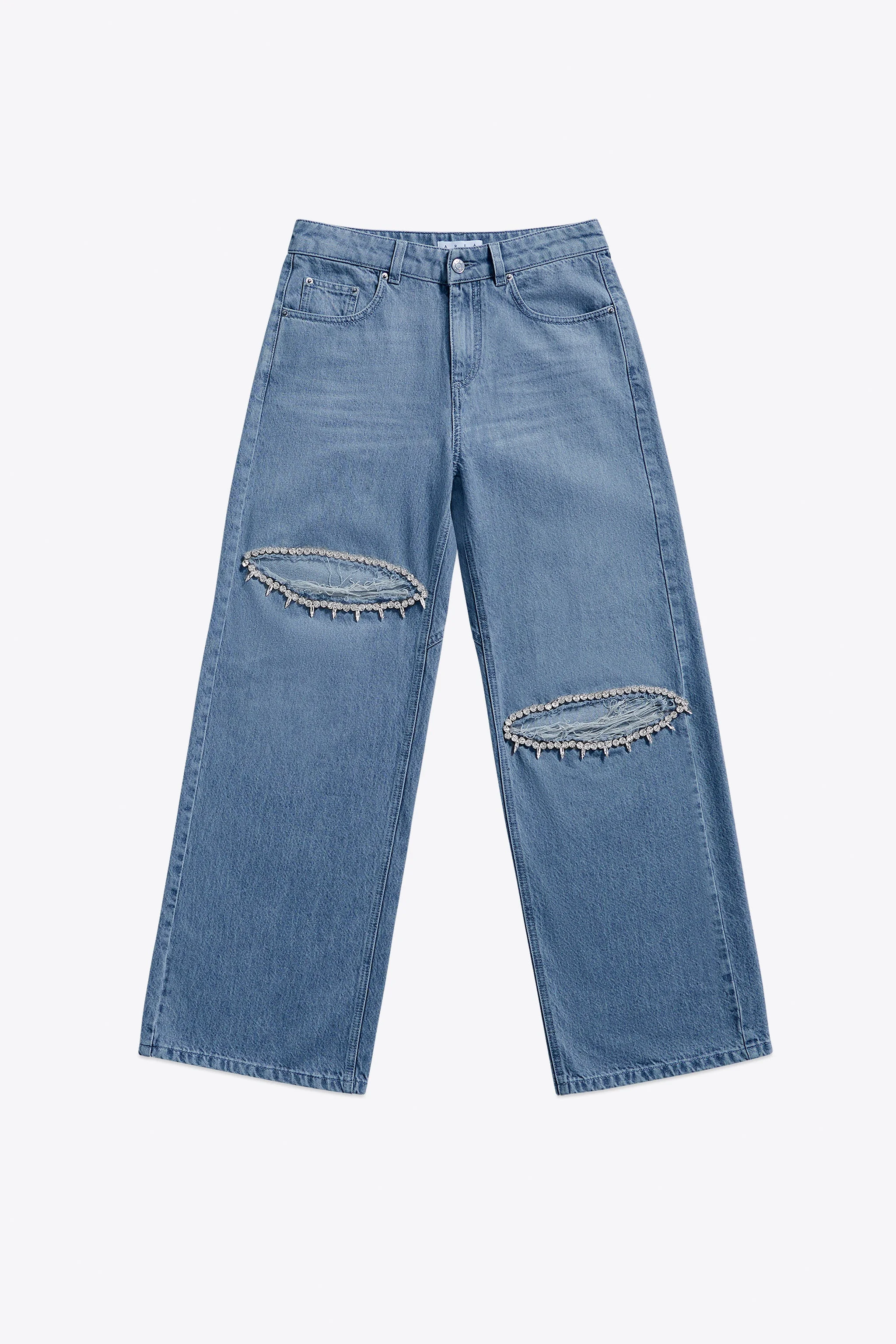 DISTRESSED CRYSTAL RELAXED SLIT JEAN