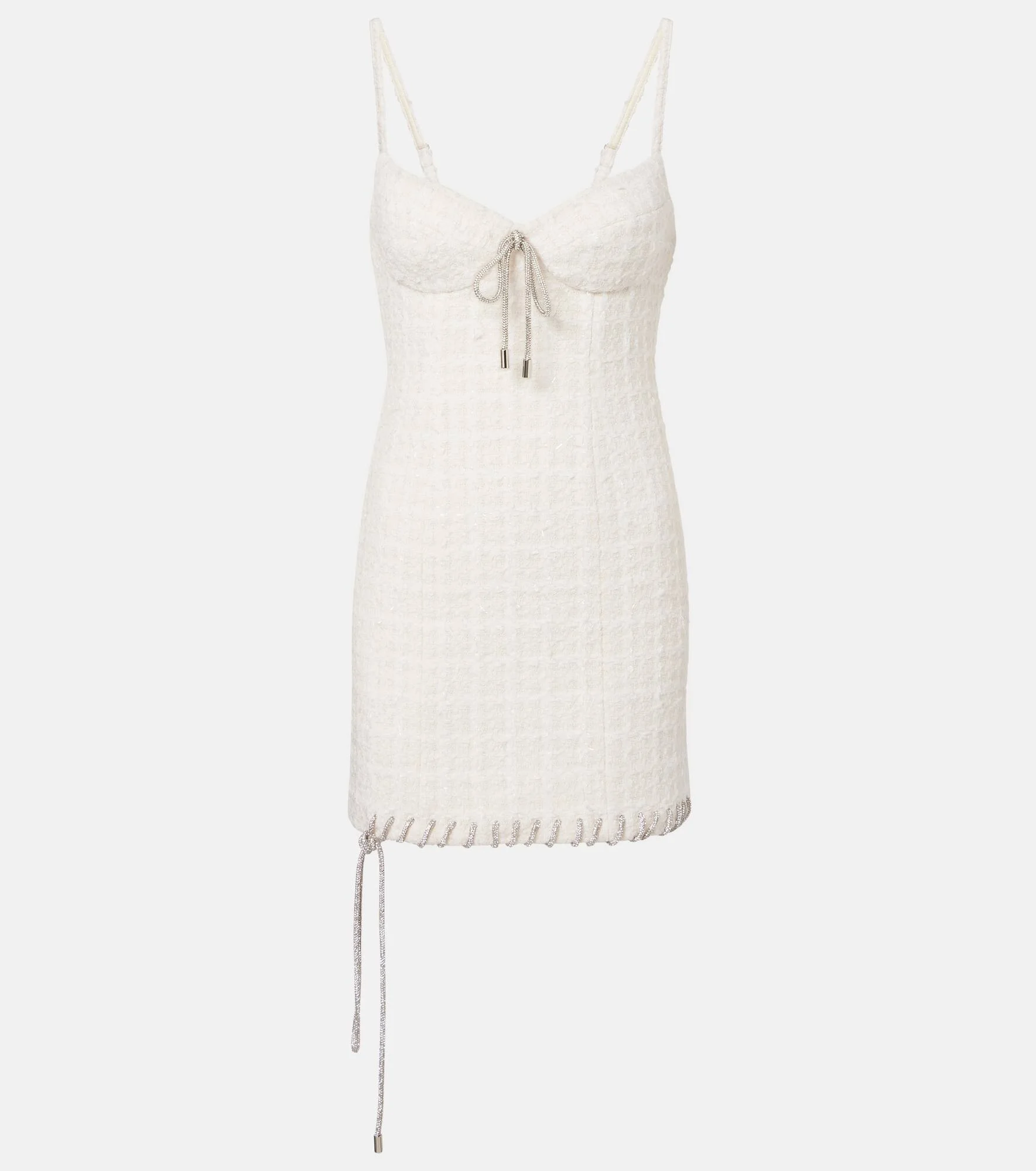 Named after the iconic New York nightclub, Area takes the glamour of party dressing in a fresh direction. Made from tweed, this minidress showcases the signature crystal-embellished knot detail at the neckline and hem. Product Details - Material: 70% polyester, 30% wool - Care instructions: dry clean - Made in China - Color: white - Designer color name: Cream White - Lining: 100% viscose - Closure: concealed zipped back - Underwired cups - Item number: P01136388 Size & Fit - True to size - Internal boned corset for support - Fitted - Non-stretchy fabric - Padded, underwired top - The model seen in the picture is 178cm-5'10" and wearing a size XS