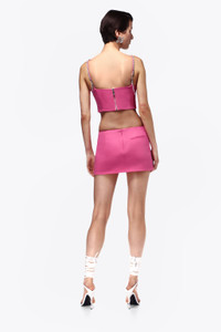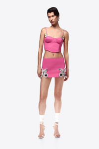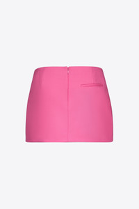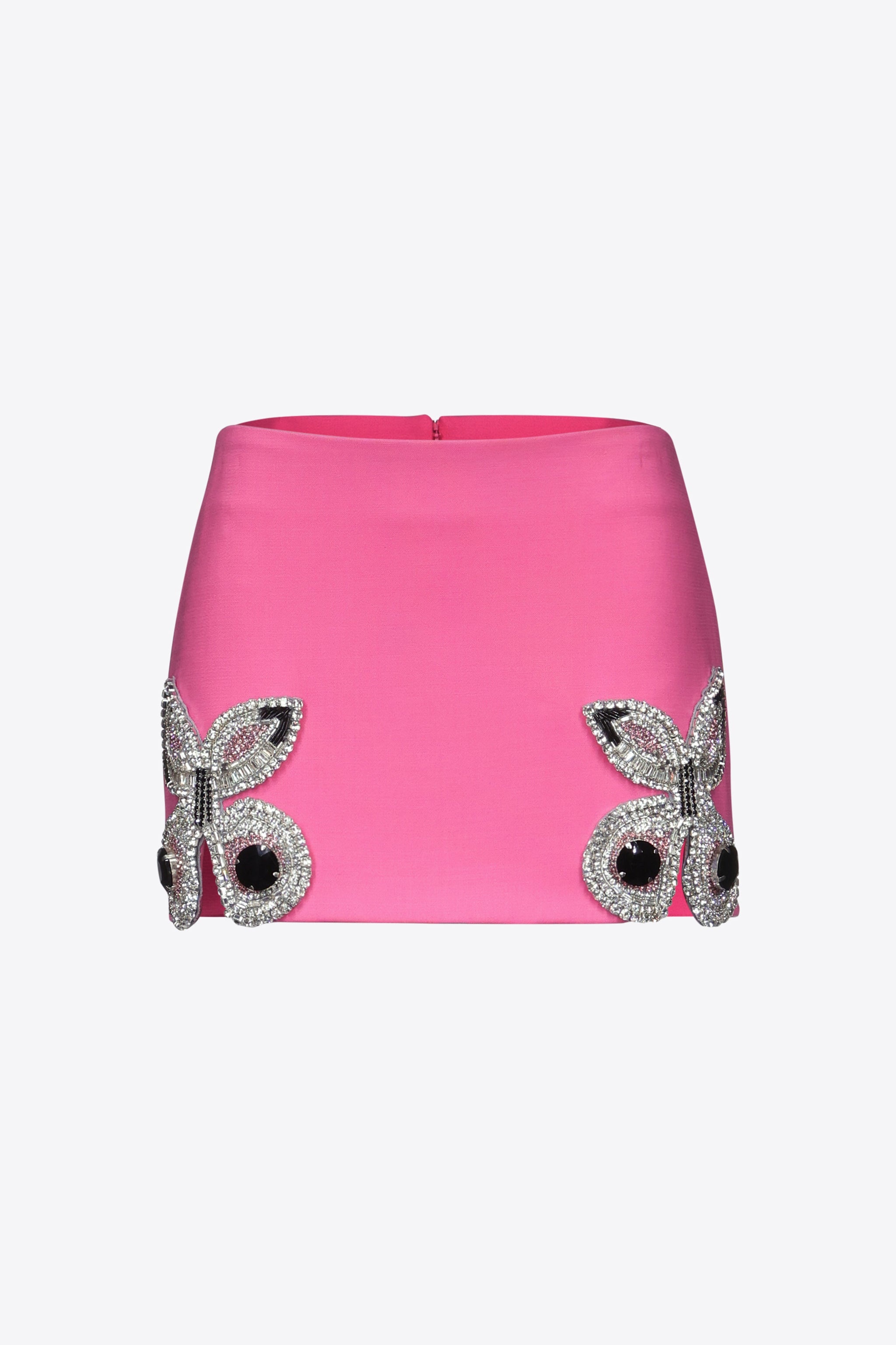 Wool suiting mini skirt with embroidered crystal butterfly detail. Features front thigh slits and hidden back zipper. Available in Carmine Rose & Black. - 99% Virgin Wool, 1% Lycra - Dry Clean Only - Model is 5'10" and wears a size US 2
