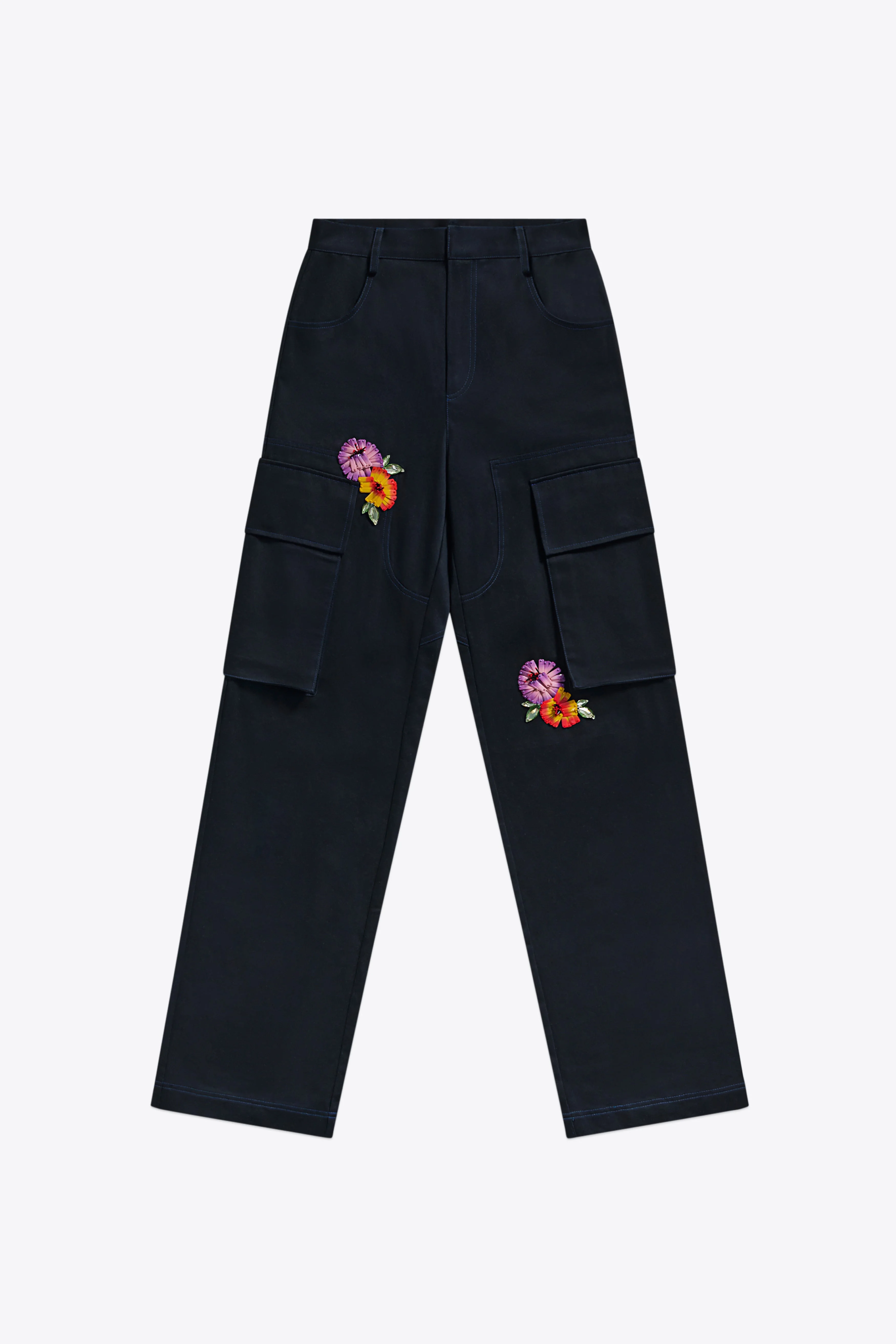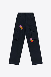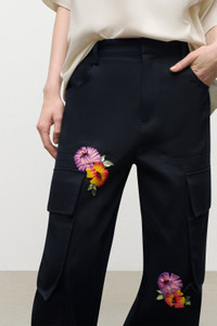 Cotton gabardine cargo pants featuring embroidered flower embellishment. Available in Black. - 100% Cotton - Dry Clean Only - Model is 5'9.5" and wears a size S