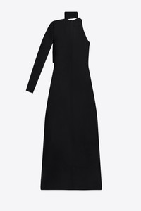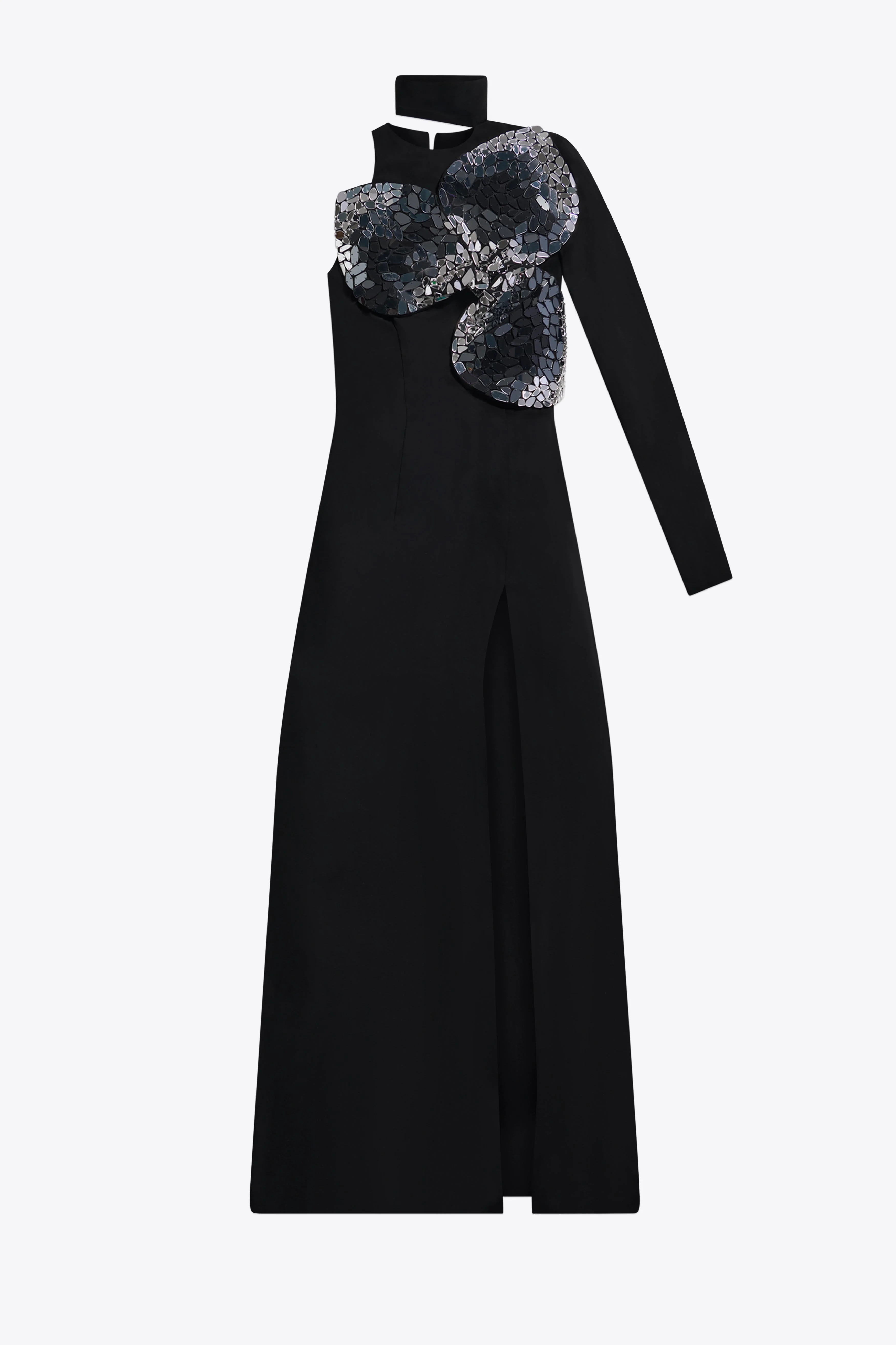 Jersey one shoulder gown with front thigh slit and ombre flower embellishment. Available in Black. - 100% Viscose - Dry Clean Only - Model is 5'8" and wears a size US 2
