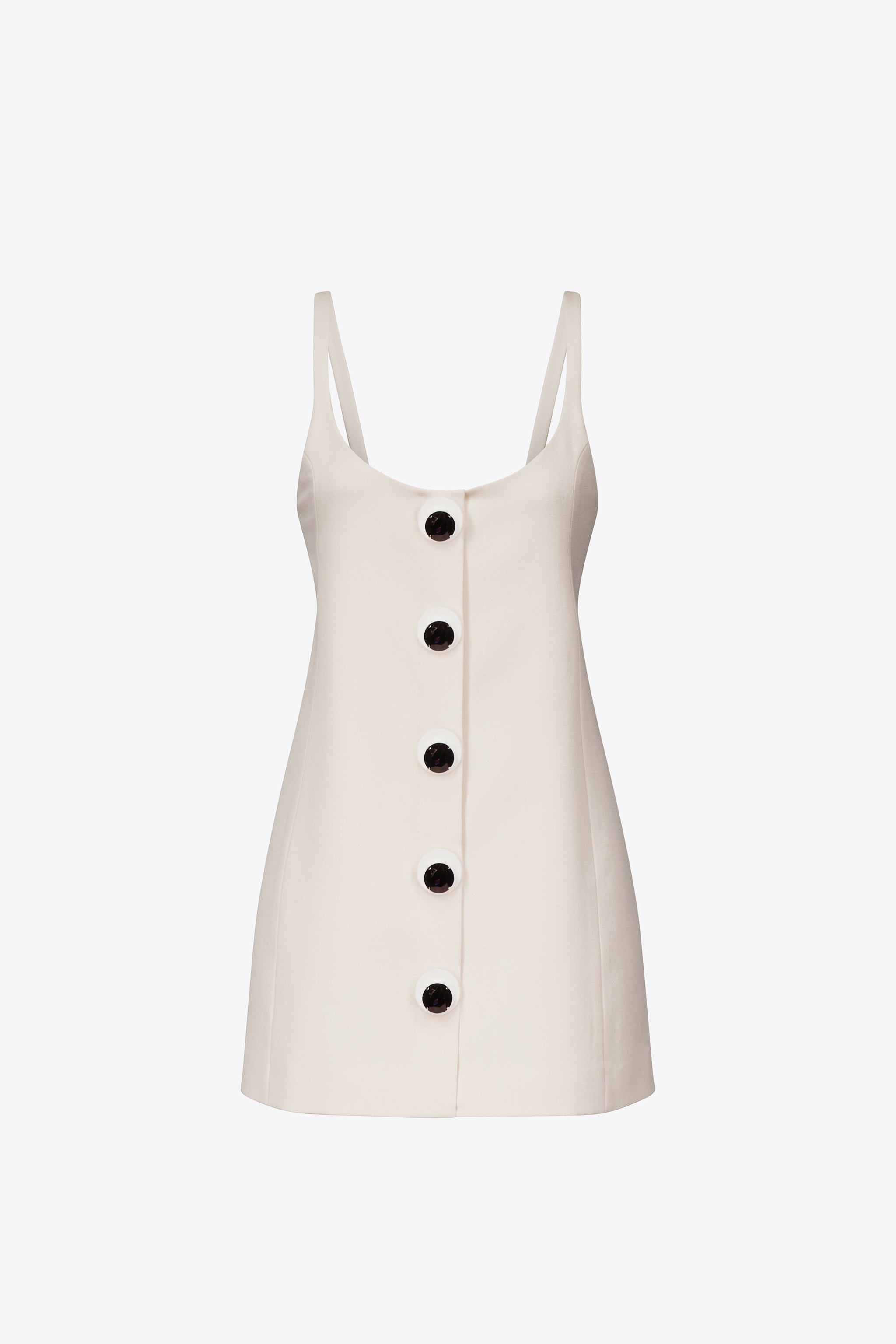 Wool suiting mini dress featuring crystal button embroidery at front. Adjustable straps with invisible zip closure at center back. Available in Whipped White. - 100% Wool - Dry Clean Only - Model is 5'9" and wears a size US 2