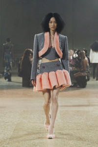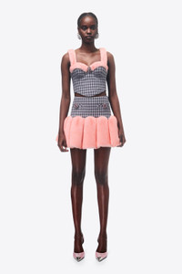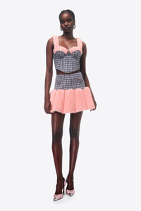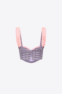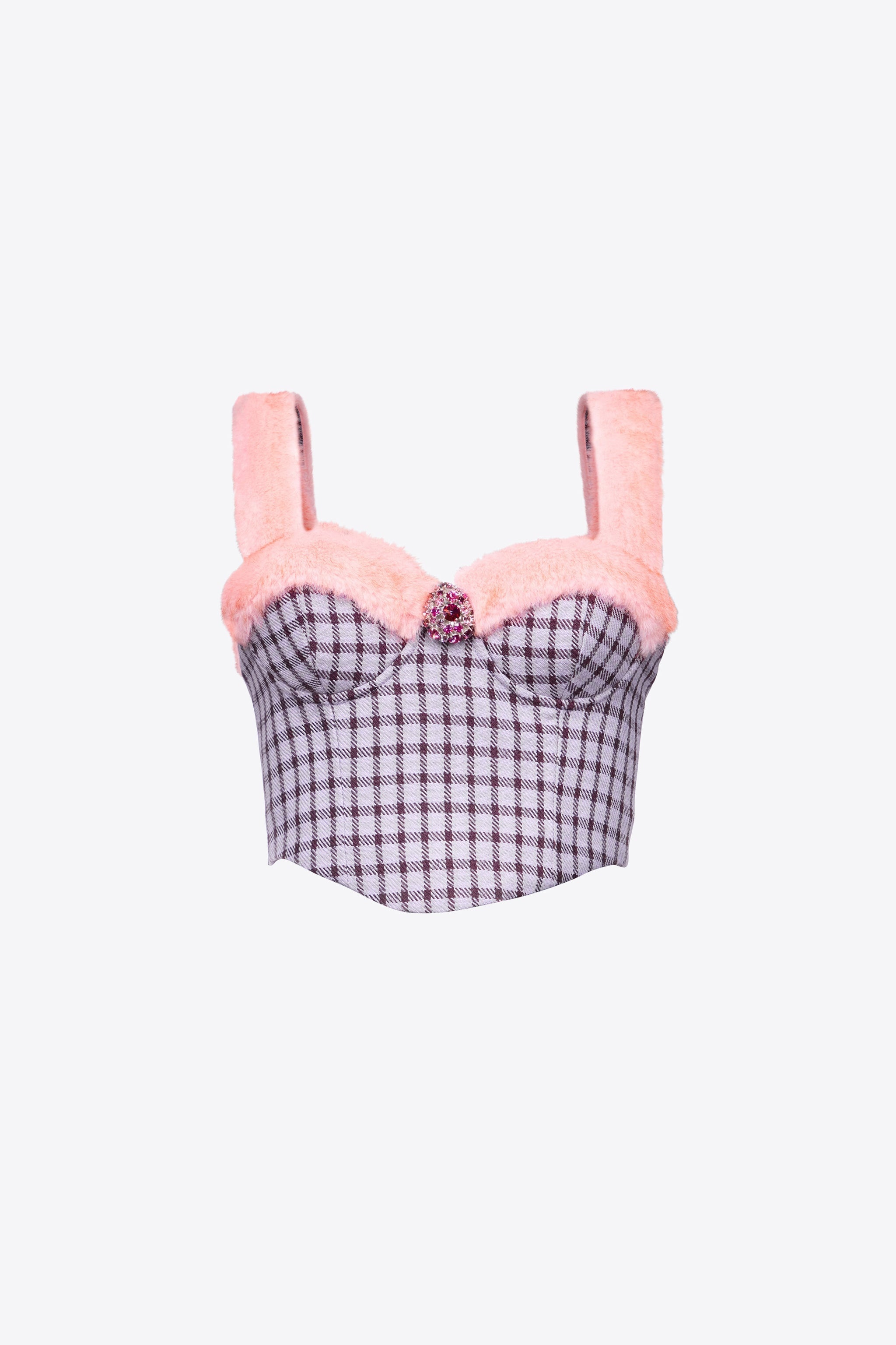 Plaid wool bustier featuring crystal cluster button at center front, faux fur trim, and adjustable straps. Available in Lilac Multi & Caramel Multi. - Runway - 74% Virgin Wool, 26% Cotton; Lining: 100% Viscose Faux Fur Combo: 100% Polyester - Model is 5'10 and wears a size US 2 - Dry clean only