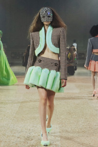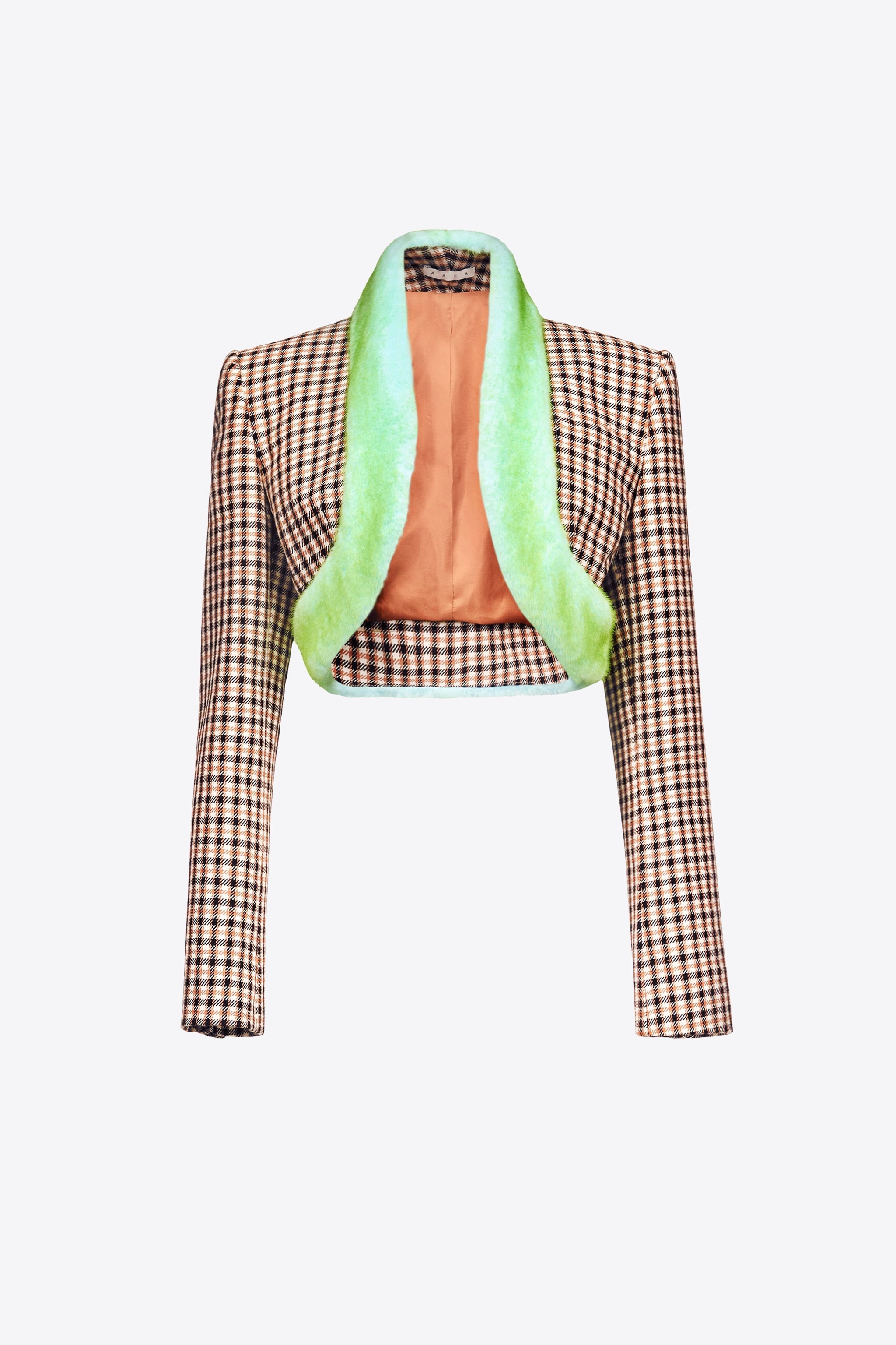 Plaid wool cropped blazer with faux fur trim. Available in Caramel Multi & Lilac Multi. - Runway - 74% Virgin Wool, 26% Cotton; Lining: 100% Viscose Faux Fur Combo: 100% Polyester - Model is 5'10 and wears a size US 2 - Dry clean only