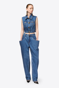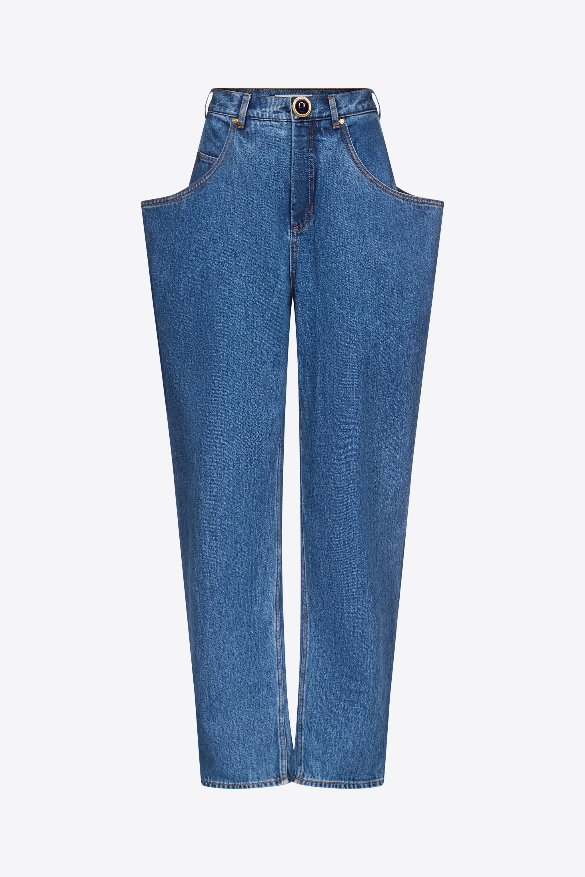 Denim flare pocket mid rise jean. Features gemstone front button & zip / fly closure. Available in Medium Blue. - 100% Cotton - Dry Clean Only - Model is 5'10.5" and wears a size 26