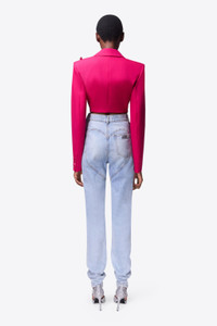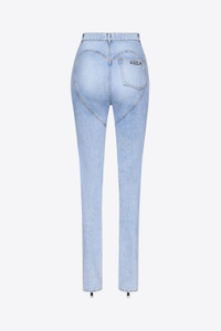 Denim high waisted slim leg jeans featuring detachable flower corsage with heart-cut feathers, ankle zips, and 'AREA' crystal nameplate at rear pocket. Available in Super Light Wash. - 100% Cotton - Dry Clean Only - Model is 5'10" and wears a size 26