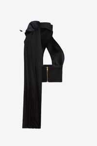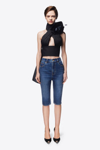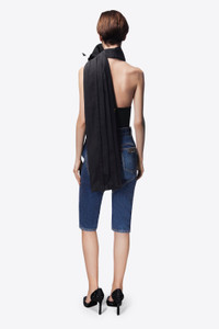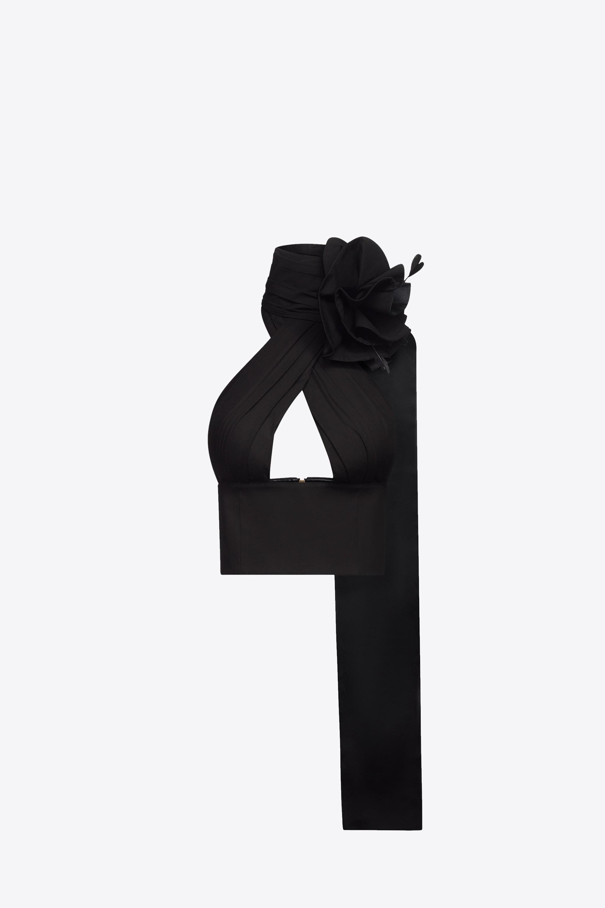 Cotton poplin halter top with satin flower corsage embellishment at neck. Features snap button neck closure and exposed zipper at center back. Available in Black. - 100% Cotton - Dry Clean Only - Model is 5'10" and wears a size US 2