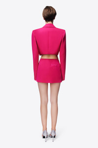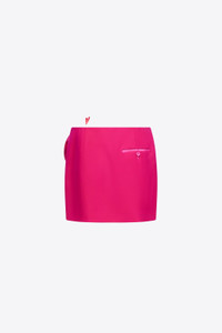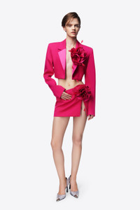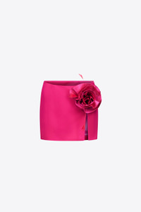 Wool suiting mini skirt with detachable satin flower corsage detail. Features front thigh slit and welt pocket detailing at rear. Available in Raspberry & Black. - Made in Italy - 100% Wool - Dry Clean Only - Model is 5'10" and wears a size US 2