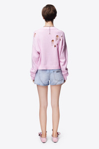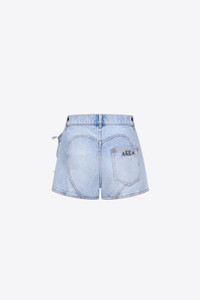 Denim mid rise shorts featuring detachable flower corsage with heart-cut feathers, side slit and 'AREA' crystal nameplate at rear pocket. Available in Super Light Wash. - 100% Cotton - Dry Clean Only - Model is 5'10" and wears a size 26