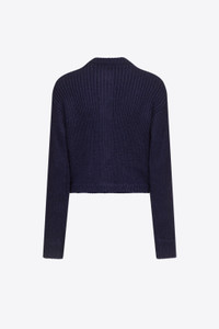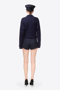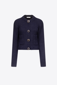 Knit cardigan featuring gemstone snap button closure and front patch pockets. Available in Midnight Blue & Light Beige. - Made in Italy - 46% Acrylic, 28% Wool Mohair, 19% Polyamide, 7% Polyester - Dry Clean Only - Model is 5'10.5" and wears a size S