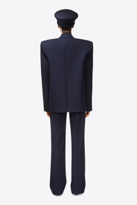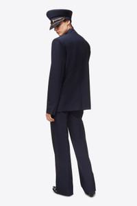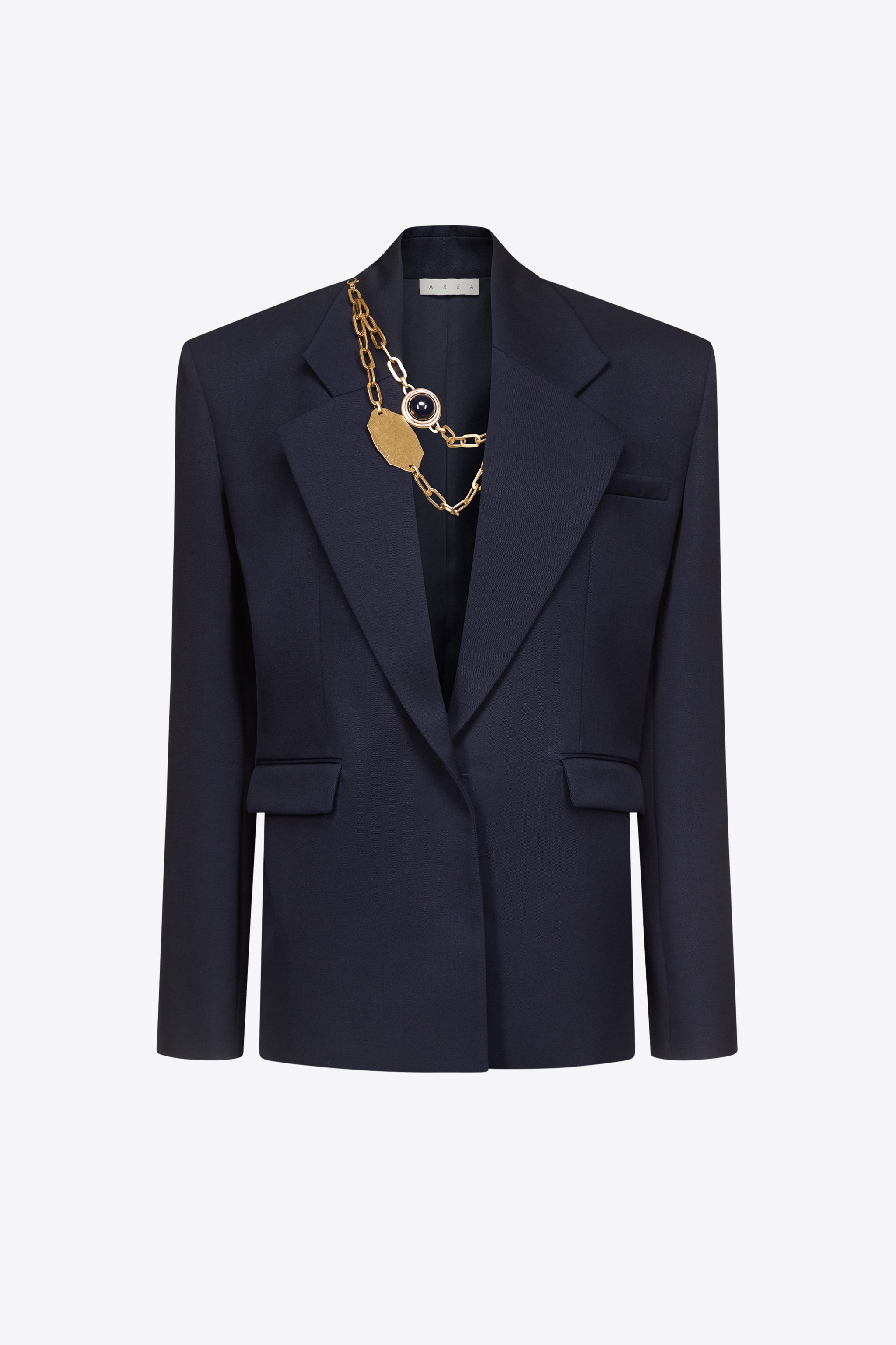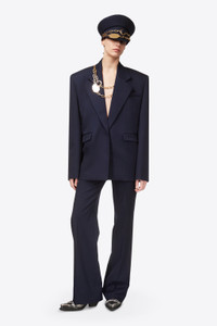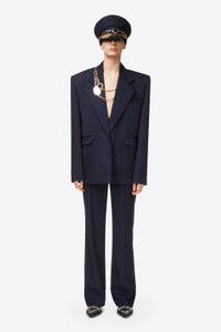 Wool suiting single breasted oversized blazer. Features detachable gemstone chain plate and front flap pockets. Available in Midnight Blue. - 100% Virgin Wool - Dry Clean Only - Model is 5'9.5" and wears a size US 2