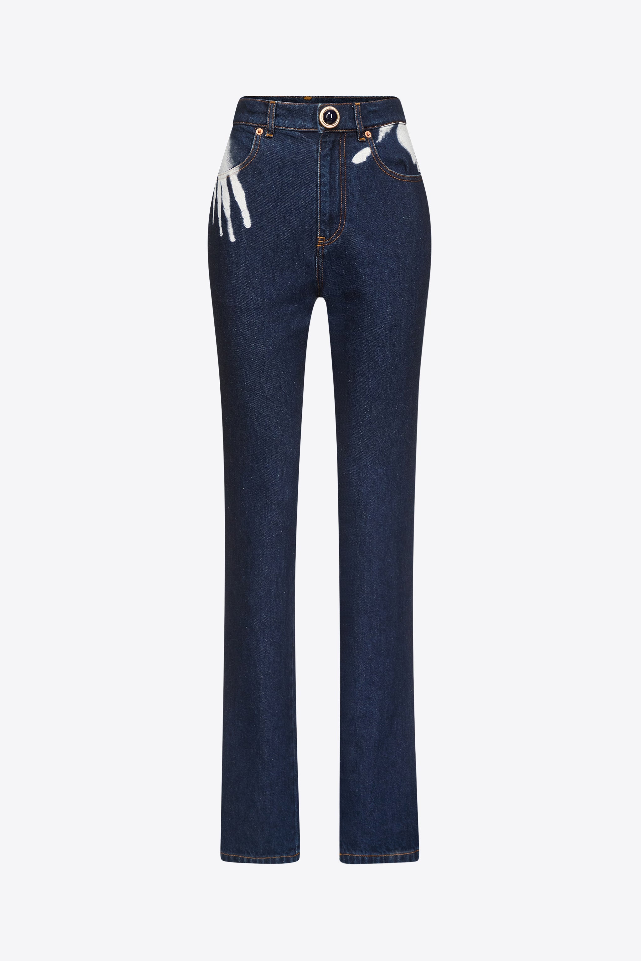 Denim handprint mid-rise straight leg jean. Features gemstone button and zip / fly closure. Available in Dark Blue. - Made in Italy - 100% Cotton - Dry Clean Only - Model is 5'10.5" and wears a size 26