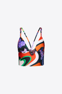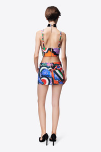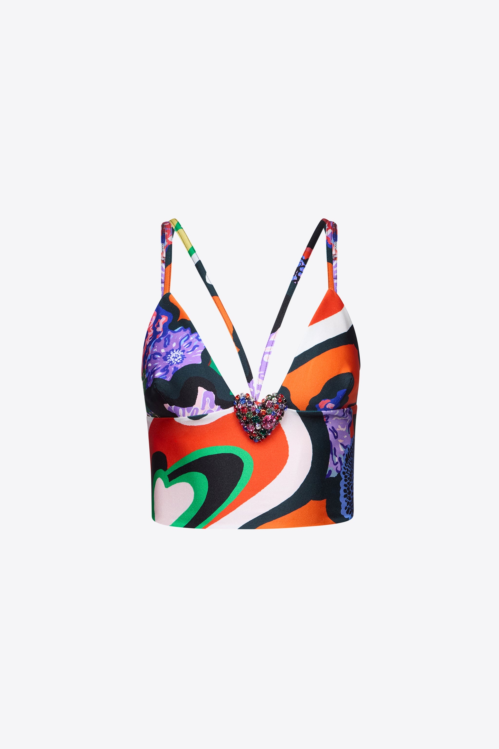 Heart printed lycra cami top featuring crystal cluster heart embellishment at center front, adjustable shoulder strap and exposed zipper at rear. Available in Multi. - Made in Italy - 80% Polyamide, 20% Elastane - Dry Clean Only - Model is 5'10" and wears a size S
