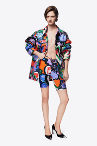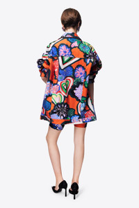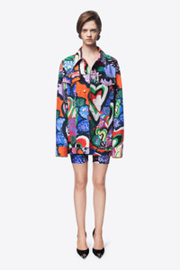Heart printed oversized denim jacket. Features denim shank button closure and flap pockets at front. Available in Multi. - 100% Cotton - Dry Clean Only - Model is 5'10" and wears a size US 2