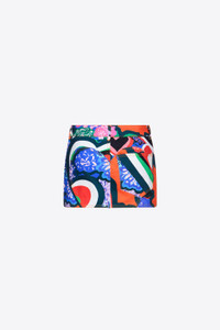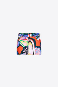 Heart printed denim mini skirt with zip / fly closure at center front and signature heart patch at rear. Available in Multi. - 100% Cotton - Dry Clean Only - Model is 5'10" and wears a size 26