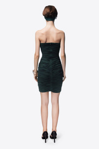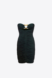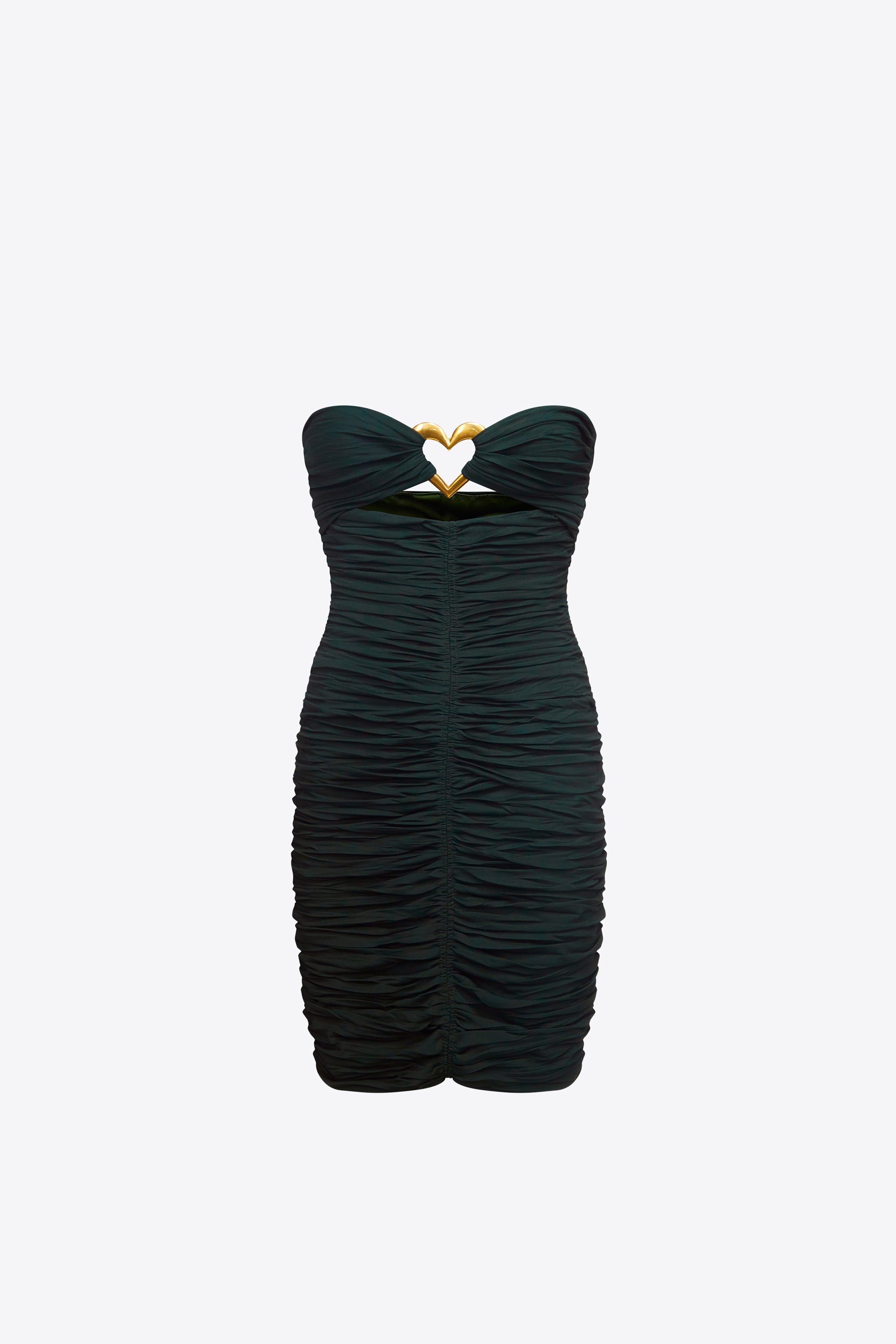 Ruched strapless mini dress of lightweight jersey draped around a brass heart jewel. Invisible zipper at center back. Available in Green & Off White. - 60% Rayon, 35% Modal, 5% Elastane - Dry Clean Only - Model is 5'10" and wears a size S