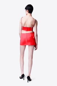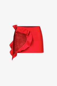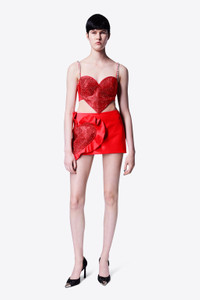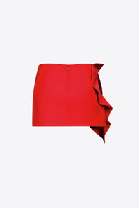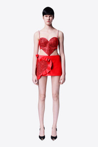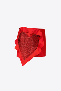 Wool suiting ruffle mini skirt featuring crystal embellished heart. Available in Scarlet. - Shell: 98% Virgin Wool, 2% Elastane Lining: 100% Viscose - Dry Clean Only - Model is 5'10" and wears a size US 2