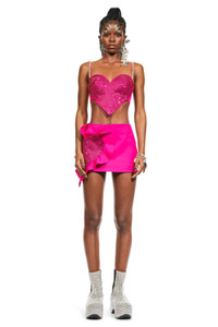 Wool crepe heart ruffle mini skirt. Available in Fuchsia. - 99% Wool, 1% Elastane - Dry Clean Only - Model is 5'10" and wears a size US 2