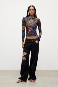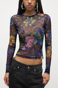 Floral printed tulle long sleeve top with crystal embellishment. Available in Multi. - Made in Italy - 92% Polyester, 8% Elastane - Dry Clean Only - Model is 5'8" and wears a size S