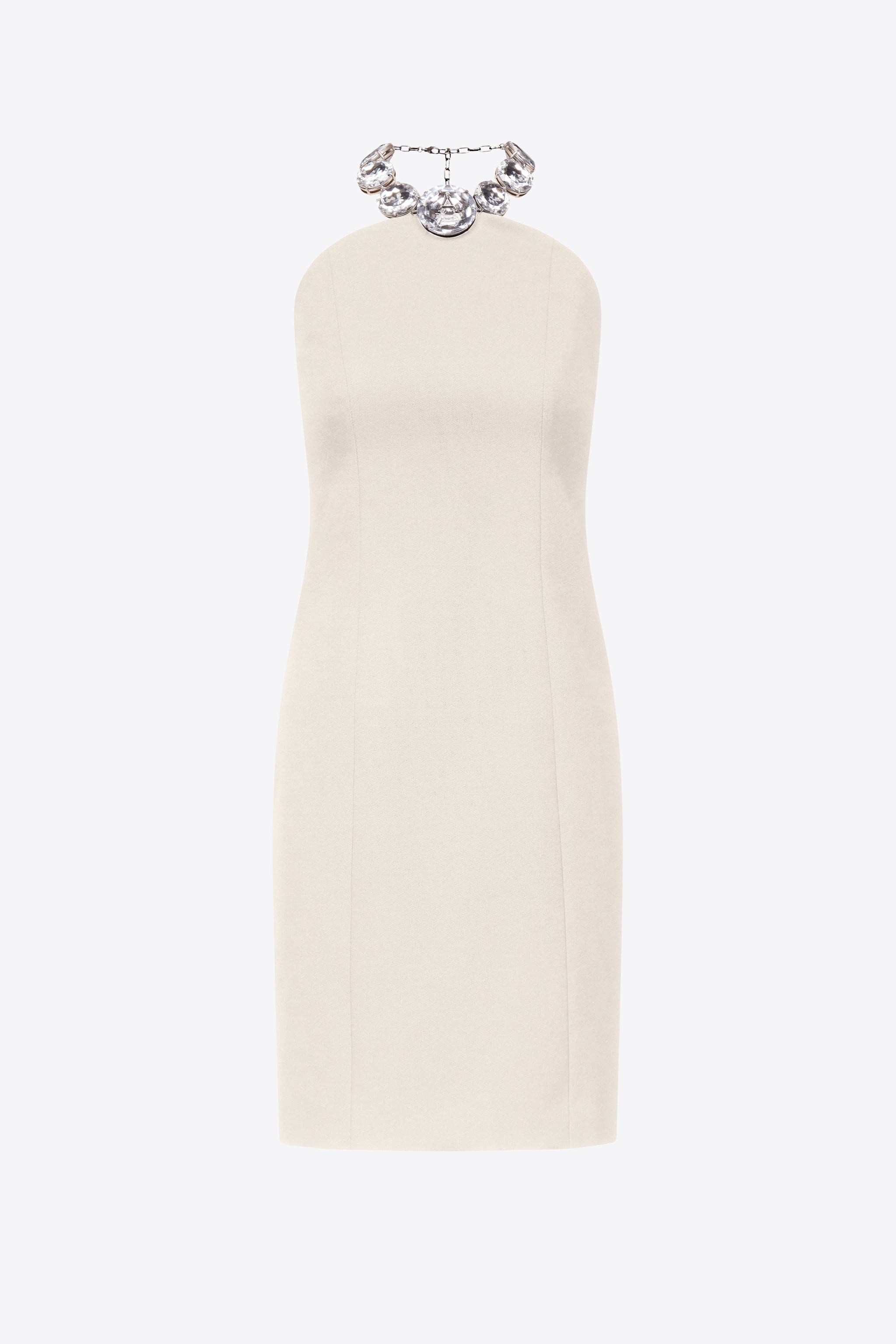 Wool suiting halter dress featuring jumbo crystal embroidery. Invisible zip closure at center back and adjustable chain at neck. Available in Whipped White & Black. - 100% Wool - Dry Clean Only - Model is 5'9" and wears a size US 2