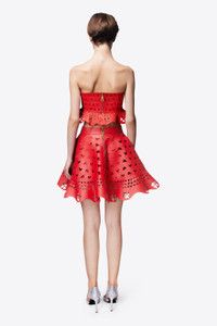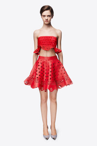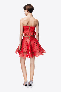 Nappa leather bandeau top with laser-cut heart detail throughout. Features ruffle hem and exposed zipper at center back. Available in Red & Black. - Made in Italy - 100% Lamb - Dry Clean Only - Model is 5'10" and wears a size US 2