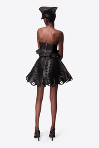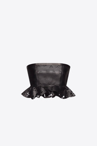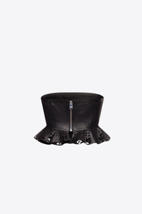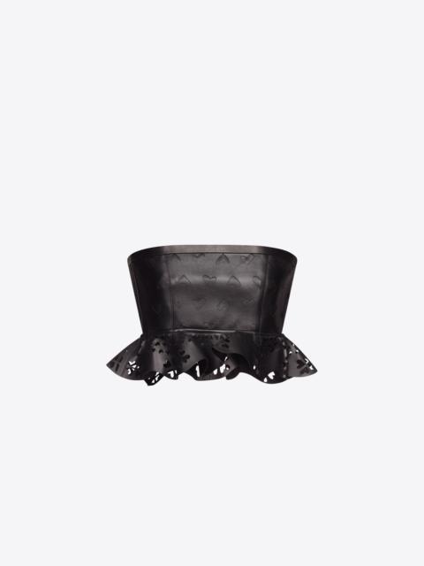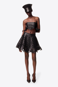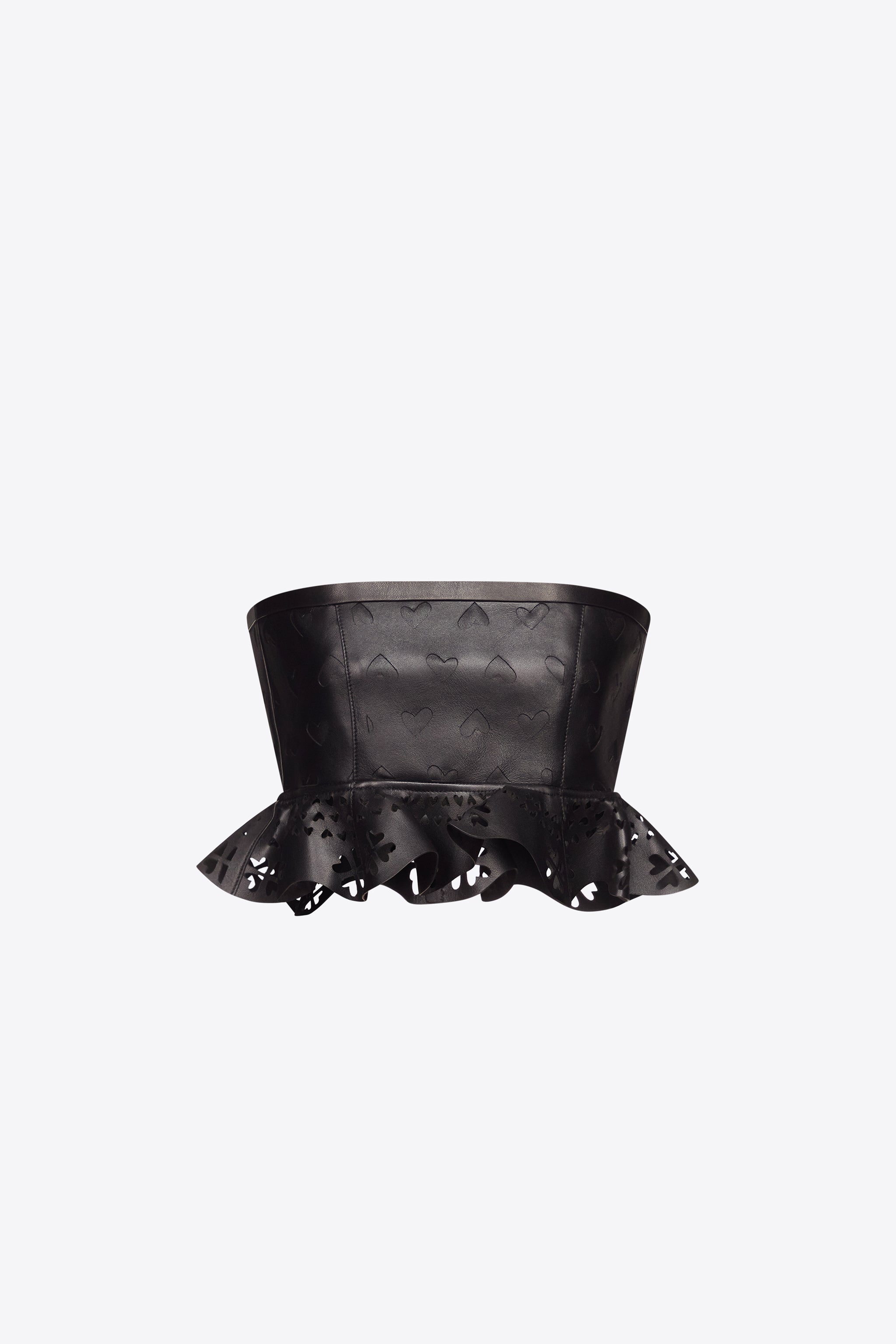 Nappa leather bandeau top with laser-cut heart detail throughout. Features ruffle hem and exposed zipper at center back. Available in Black & Red. - Made in Italy - 100% Lamb - Dry Clean Only - Model is 5'10" and wears a size US 2