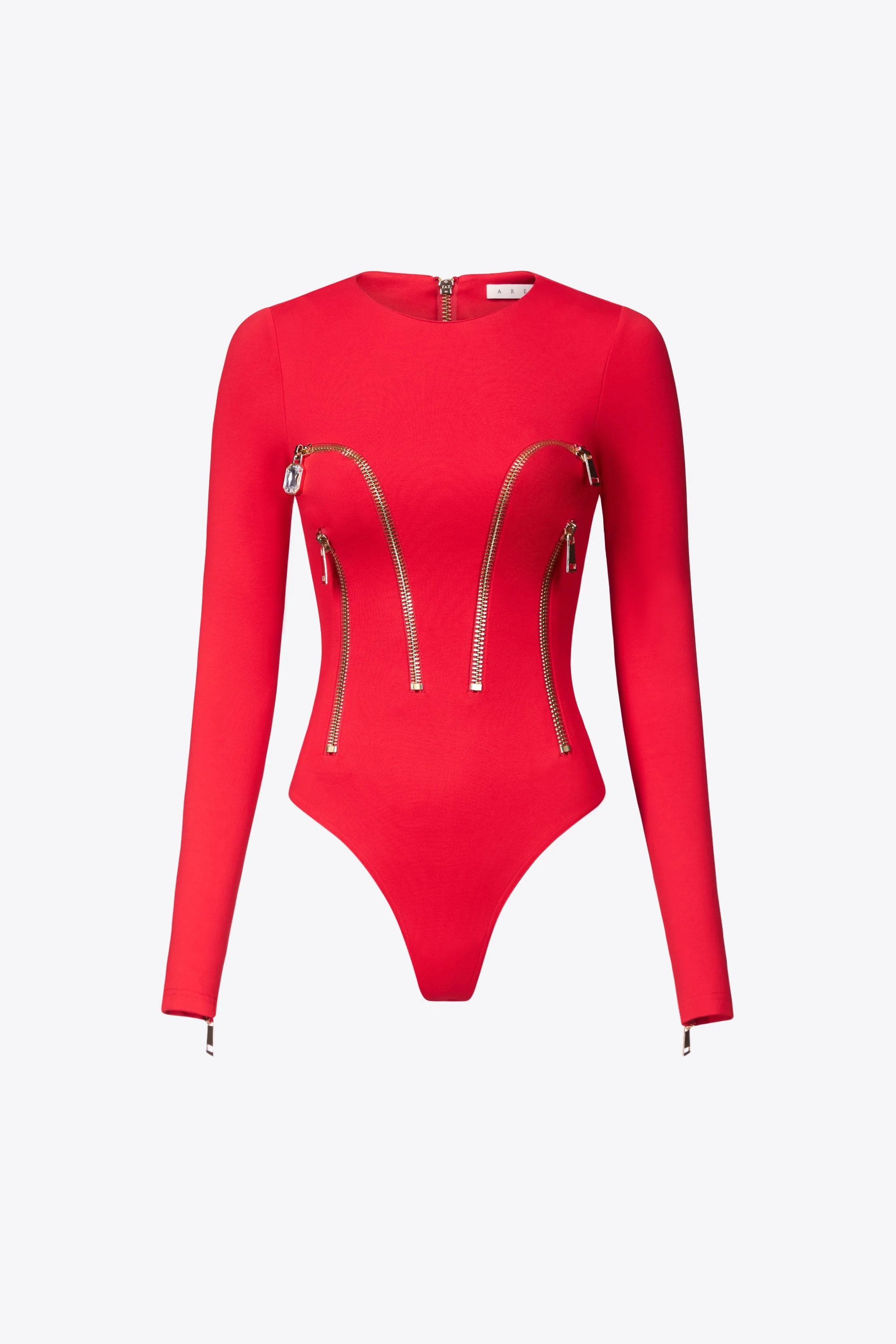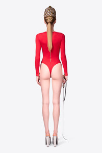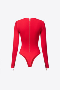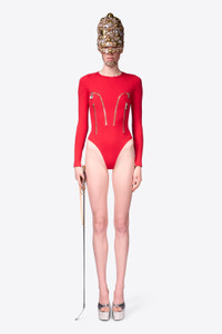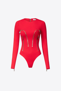Compact ponte jersey bodysuit featuring zipper embellishments, crystal zip pull, and snap buttons at crotch. Available in Carmine & Black. - 67% Rayon, 28% Nylon, 5% Elastane - Dry Clean Only - Model is 5'11" and wears a size S