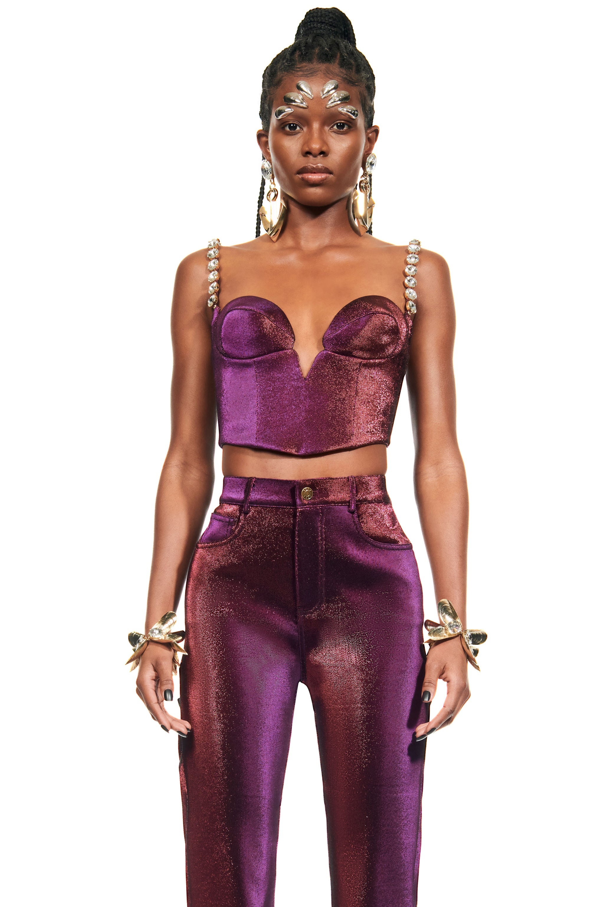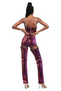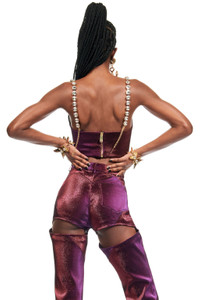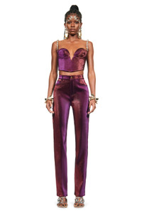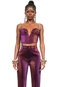 Stretch lame mussel cup bustier. Features adjustable crystal trim straps and a hidden back zipper. Available in Purple. - 40% Cotton, 36% Polyamide, 19% Polyester, 5% Elastane - Dry Clean Only - Model is 5'10" and wears a size US 2