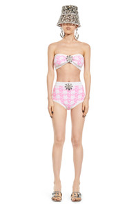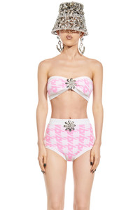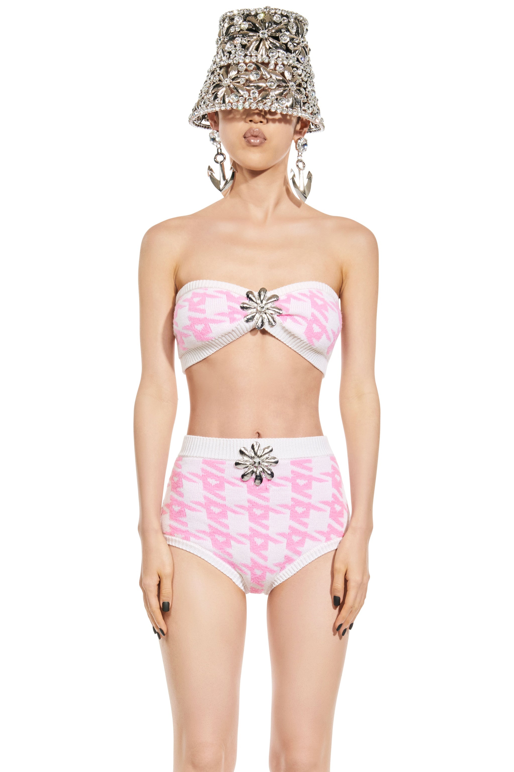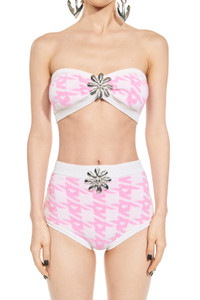 'A' houndstooth knit bandeau features mussel flower at center front. Available in Pink Multi. - Made in Italy - Color 1: 100% Polyamide, Color 2: 50% Wool, 50% Acrylic - Dry Clean Only - Model is 5'10" and wears a size S