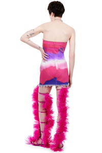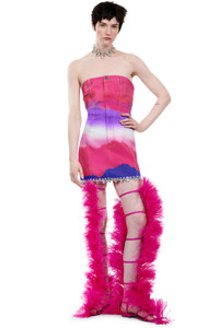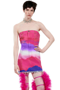 Ombre denim strapless mini dress feature front zip fly closure and raw edge hem with crystal trim. Available in Pink Multi. - 100% Cotton - Dry Clean Only - Model is 5'10" and wears a US 2