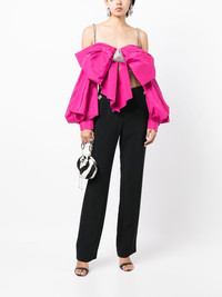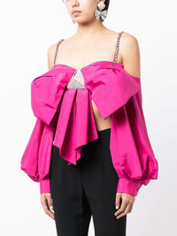oversized bow-detail top magenta oversize bow detail crystal embellishment adjustable shoulder straps rear zip fastening long sleeves cropped Imported Composition Lining: Polyester 96%, Elastane 4% Body: Polyester 100% SIZE & FIT Model measurements Height 5 ft 10 in(1.77 m) Bust/Chest 31.49 in(80 cm) Hips 35.43 in(90 cm) Waist 25.19 in(64 cm) FittingInformation This piece fits true to size. We recommend you get your regular size Designed for a close fit at the bust. If you like a looser fit, get one size up Made with a mid-weight non-stretch fabric Washing instructions Dry Clean Only