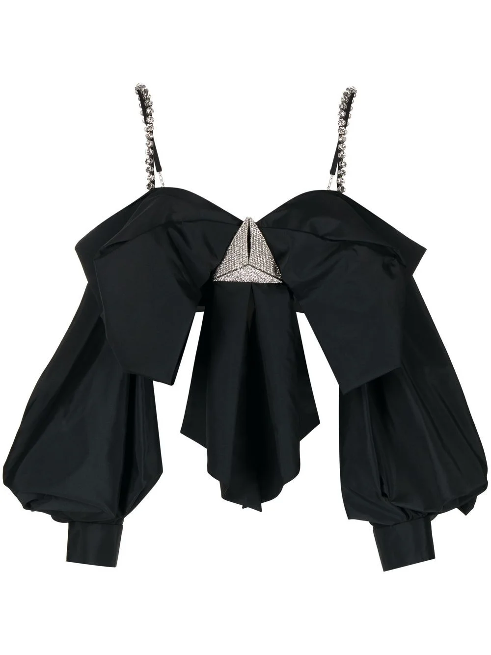 oversized bow-detail top black oversize bow detail crystal embellishment adjustable shoulder straps rear zip fastening long puff sleeves cropped Imported Composition Polyester 100% SIZE & FIT Model measurements Height 5 ft 10 in(1.77 m) Bust/Chest 31.49 in(80 cm) Hips 35.43 in(90 cm) Waist 25.19 in(64 cm) Measurement LENGTH 10.62 in(27 cm) FittingInformation This piece fits true to size. We recommend you get your regular size Designed for a close fit at the bust. If you like a looser fit, get one size up Made with a mid-weight non-stretch fabric Washing instructions Dry Clean Only
