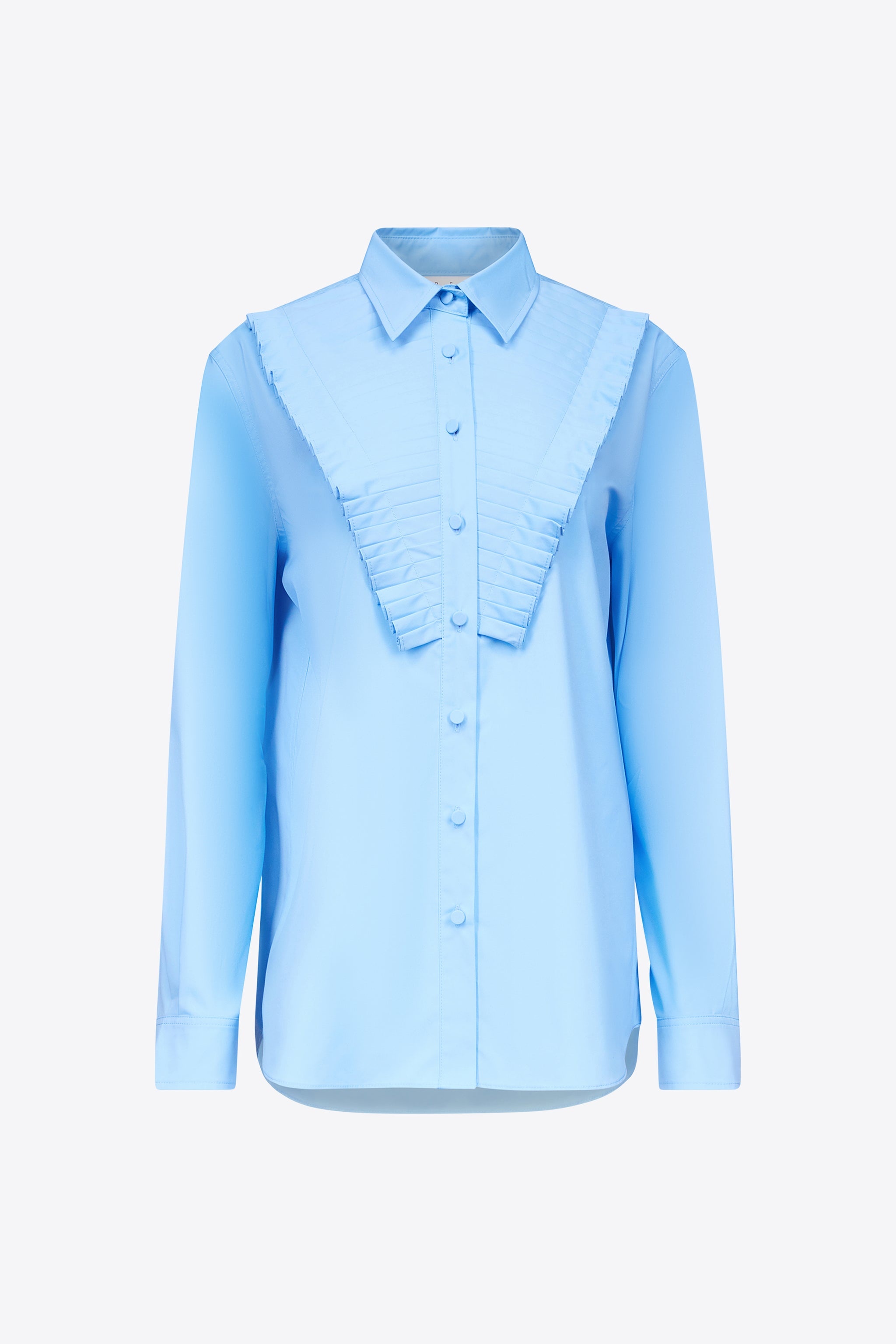 Poplin long sleeve button down tuxedo shirt featuring ruffle bib. Available in Powder Blue. - 55% Cotton, 45% Polyester - Dry Clean Only - Model is 5'10" and wears a size US 2