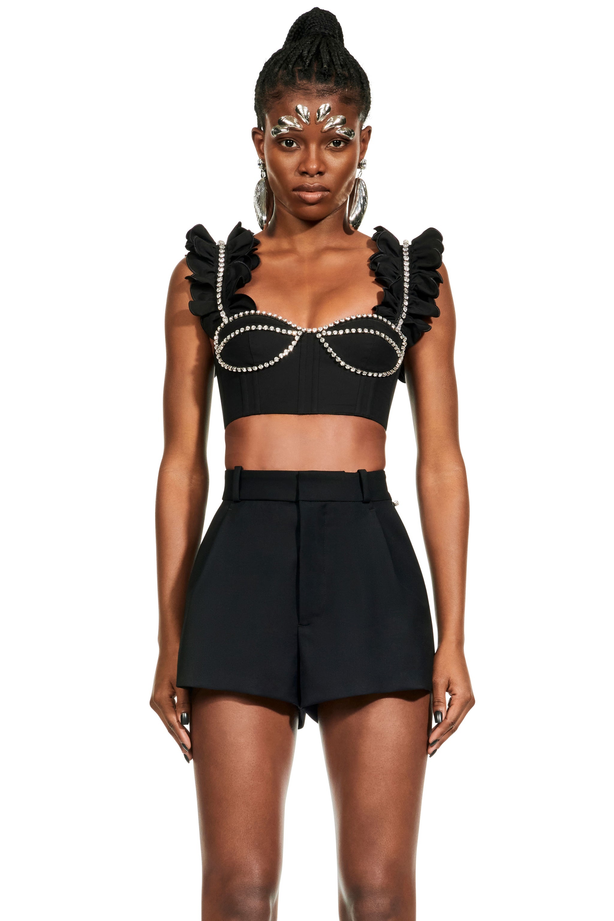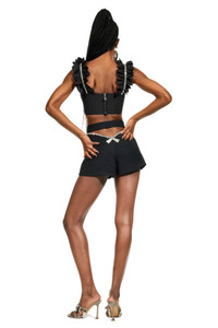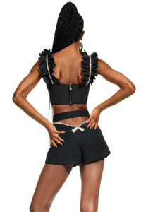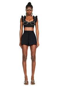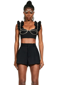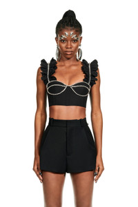 Poplin bustier with ruffle straps and crystal cupchain trim. Features back zip closure. Available in Black & White. -100% Cotton - Dry Clean Only - Model is 5'10" and wears a size US 2