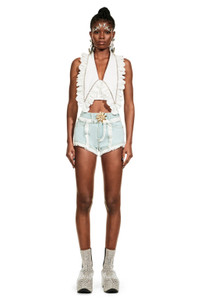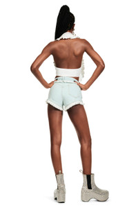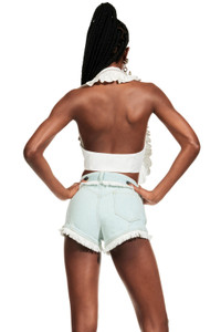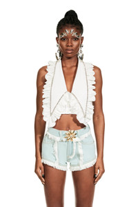 Poplin halter crop top with ruffle collar and crystal trim. Features front button closure. Available in White. -100% Cotton - Dry Clean Only - Model is 5'10" and wears a size US 2