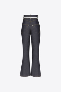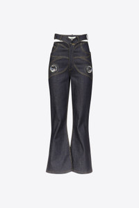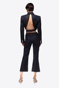 Raw denim crystal butterfly flared leg cropped jeans. Available in Dark Indigo. - 100% Cotton - Dry Clean Only - Model is 5'11.5" and wears a size US 26