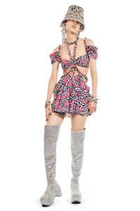 Rope printed crepe de chine cut out mini dress. Features crystal trim and adjustable rope straps at neck and waist. Available in Fuchsia Multi. - 100% Silk - Dry Clean Only - Model is 5'10" and wears a size US 2 - We recommend that you choose one size up as this dress runs small