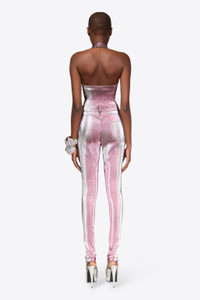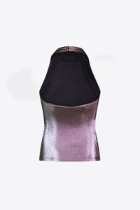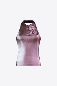 Stretch lame halter top featuring rosette embellishment. Available in Pink/Silver. - Fabric: 54%Polyester, 31% Cotton, 15% Metallic Polyester. Lining: 68% Viscose, 27% Polyester - Dry Clean Only - Model is 5'11.5" and wears a size S