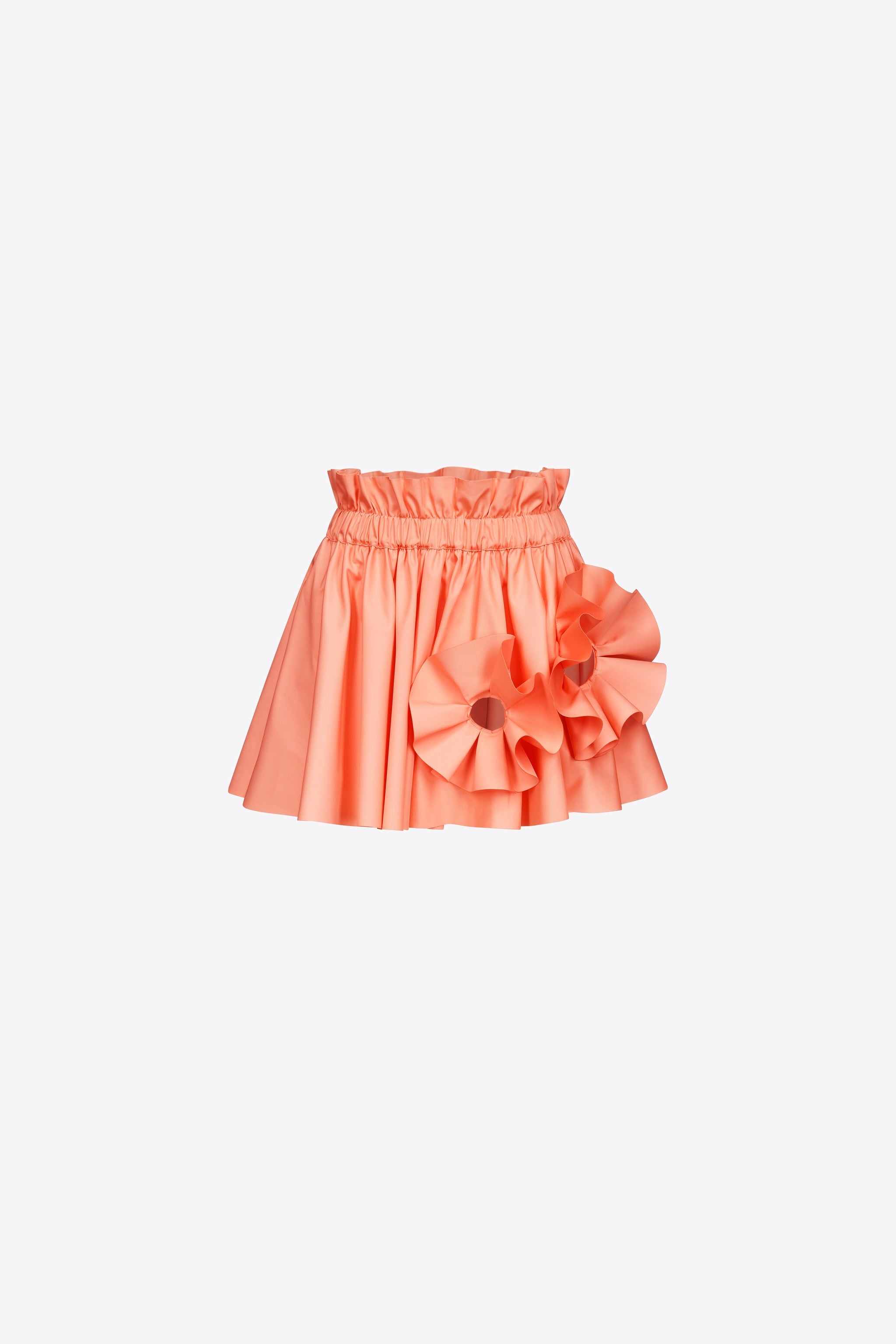 Nylon track mini skirt with ruffle flower cutout details. Available in Sweet Salmon. - 100% Polyester - Dry Clean Only - Model is 5'9" and wears a size US 2