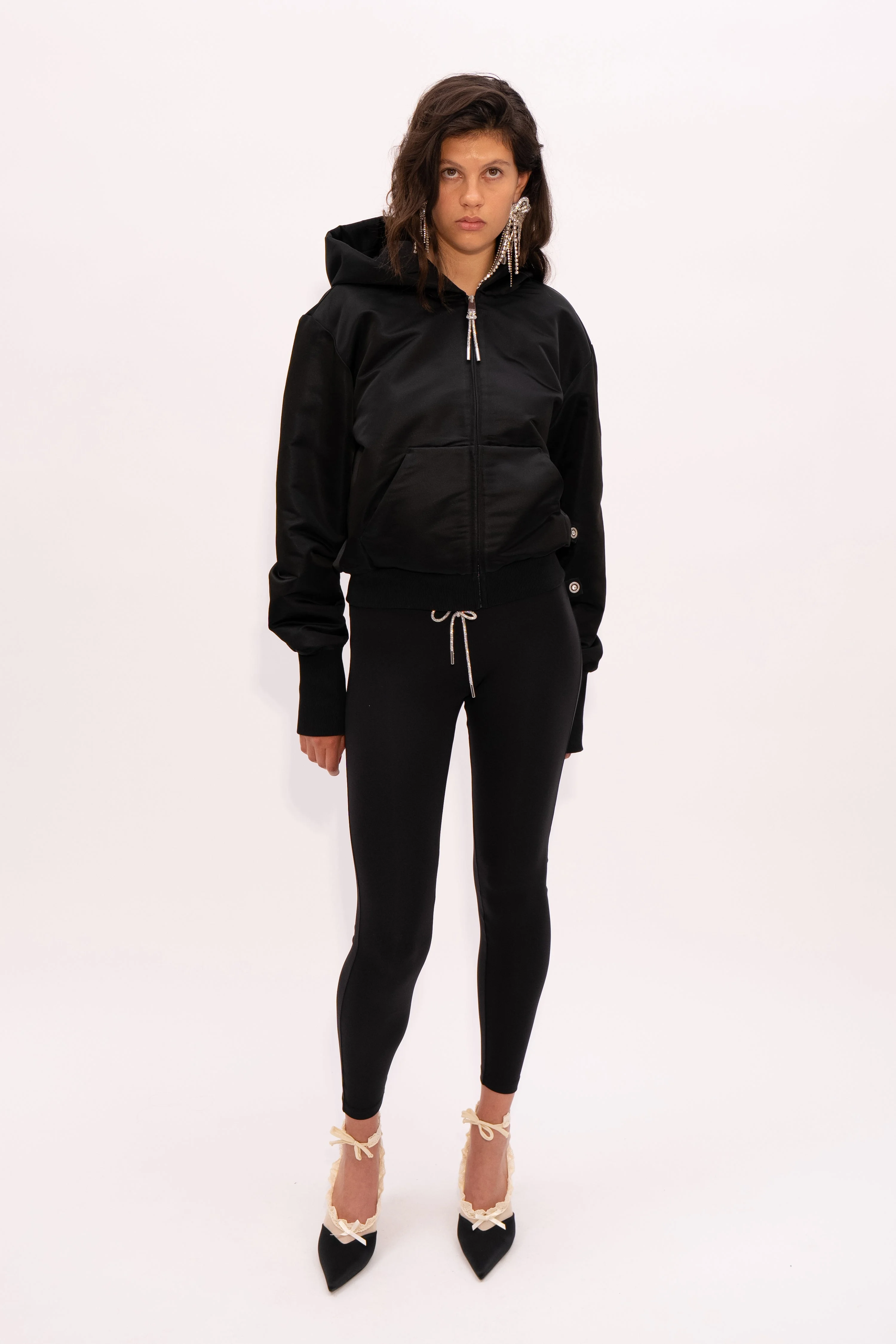 Satin long sleeve zip front hoodie. Available Black. - Made in Italy - 100% Polyester - Dry Clean Only