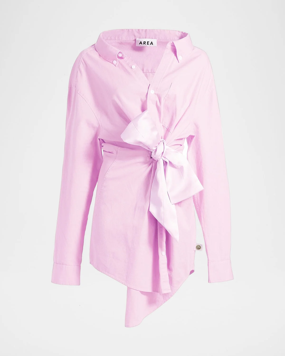 Contemporary and crisp, this tailored shirt dress from AREA features a large satin bow that adds to the femininity of this style. Spread collar Long sleeves; button cuffs Drop shoulders Button details Asymmetric hem Cotton Imported SIZE & FITModel measurements: 5 & apos;10" tallModel is wearing a US size 4/Small